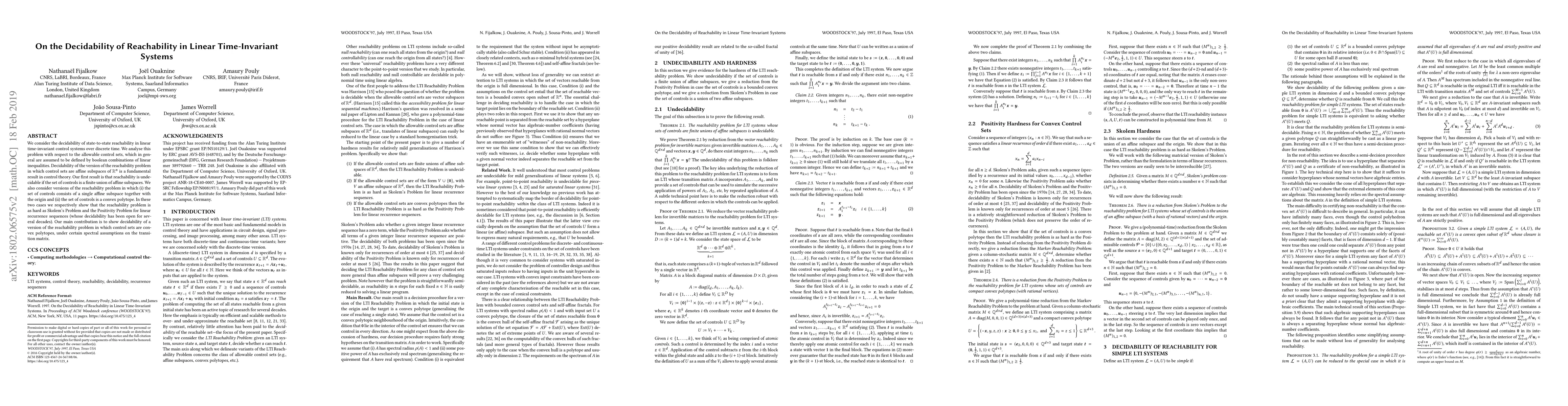 This paper investigates the decidability of state-to-state reachability in linear time-invariant systems, focusing on various control sets. It finds undecidability for finite unions of affine subspaces and presents decidability under spectral conditions for convex polytopes.
