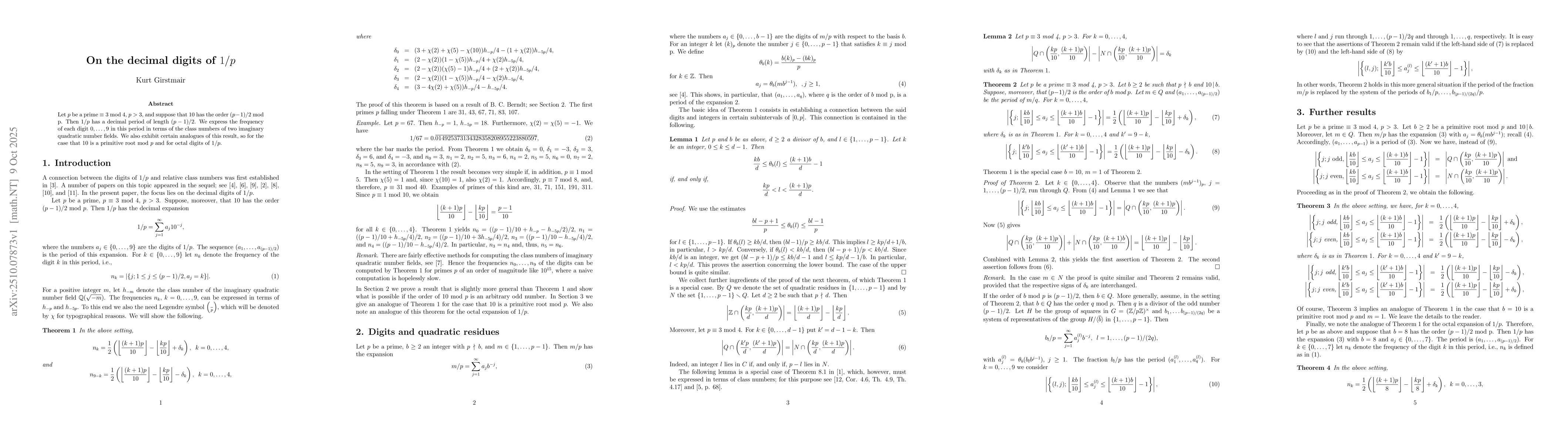 Establishes explicit formulas relating digit frequencies in decimal expansions of 1/p to class numbers of quadratic fields, leveraging properties of quadratic residues and modular orders.