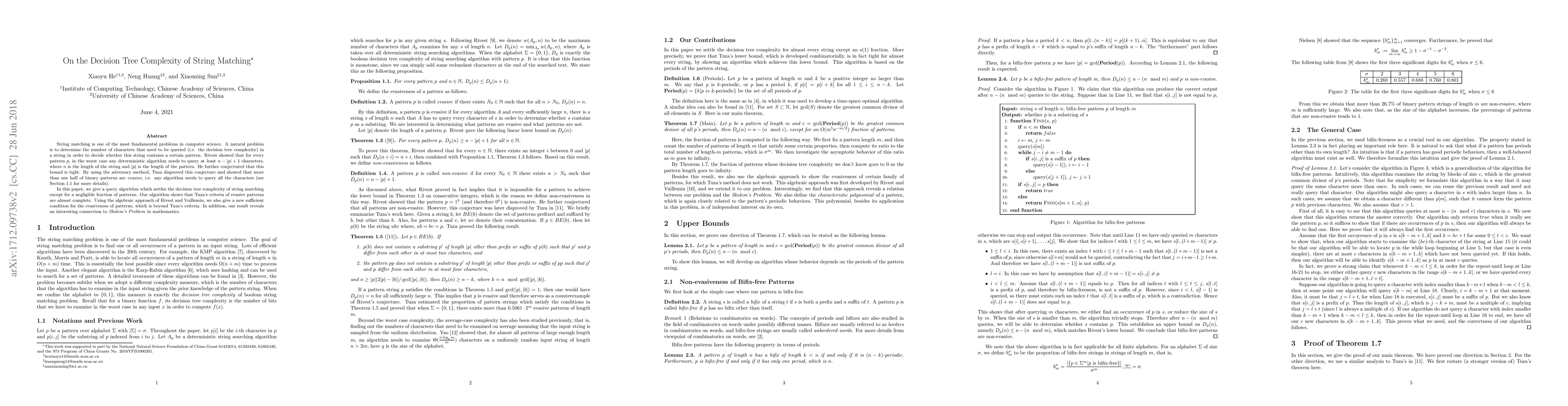 String matching is one of the most fundamental problems in computer science. A natural problem is to determine the number of characters that need to be queried (i.e. the decision tree complexity) in a string in order to decide whether this string contains a certain pattern. Rivest showed that for every pattern $p$, in the worst case any deterministic algorithm needs to query at least $n-|p|+1$ characters, where $n$ is the length of the string and $|p|$ is the length of the pattern. He further conjectured that this bound is tight. By using the adversary method, Tuza disproved this conjecture and showed that more than one half of binary patterns are {\em evasive}, i.e. any algorithm needs to query all the characters (see Section 1.1 for more details). In this paper, we give a query algorithm which settles the decision tree complexity of string matching except for a negligible fraction of patterns. Our algorithm shows that Tuza's criteria of evasive patterns are almost complete. Using the algebraic approach of Rivest and Vuillemin, we also give a new sufficient condition for the evasiveness of patterns, which is beyond Tuza's criteria. In addition, our result reveals an interesting connection to \emph{Skolem's Problem} in mathematics.