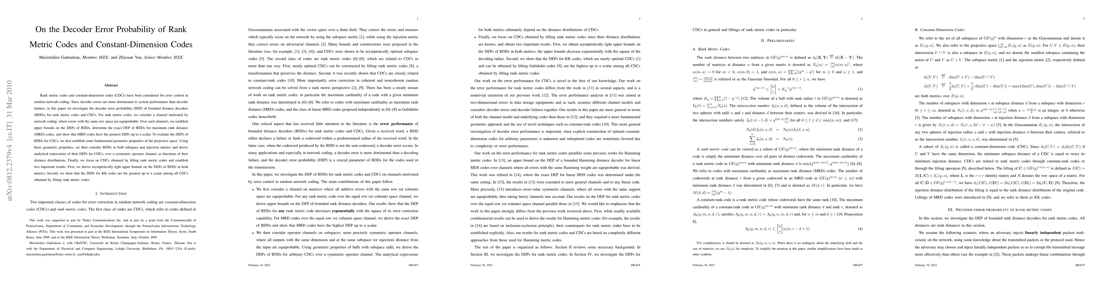 This paper investigates decoder error probabilities (DEPs) for rank metric codes and constant-dimension codes (CDCs) in random network coding. It establishes upper bounds and exact DEPs for maximum rank distance codes and derives analytical expressions for CDCs' DEPs based on distance distributions, concluding that lifted rank metric codes, specifically KK codes, have the highest DEPs.