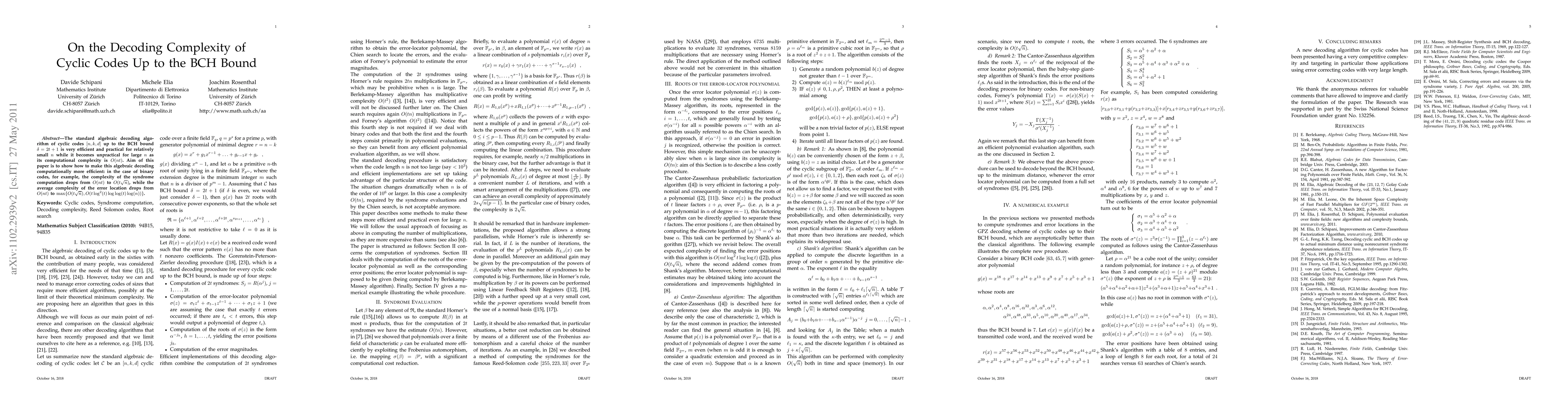 This paper improves the efficiency of algebraic decoding for cyclic codes by reducing computational complexity from O(nt) to O(t√ n) for syndrome computation and at most O(t∢ n, t≐ log(t)∤ log(n)) for error location.