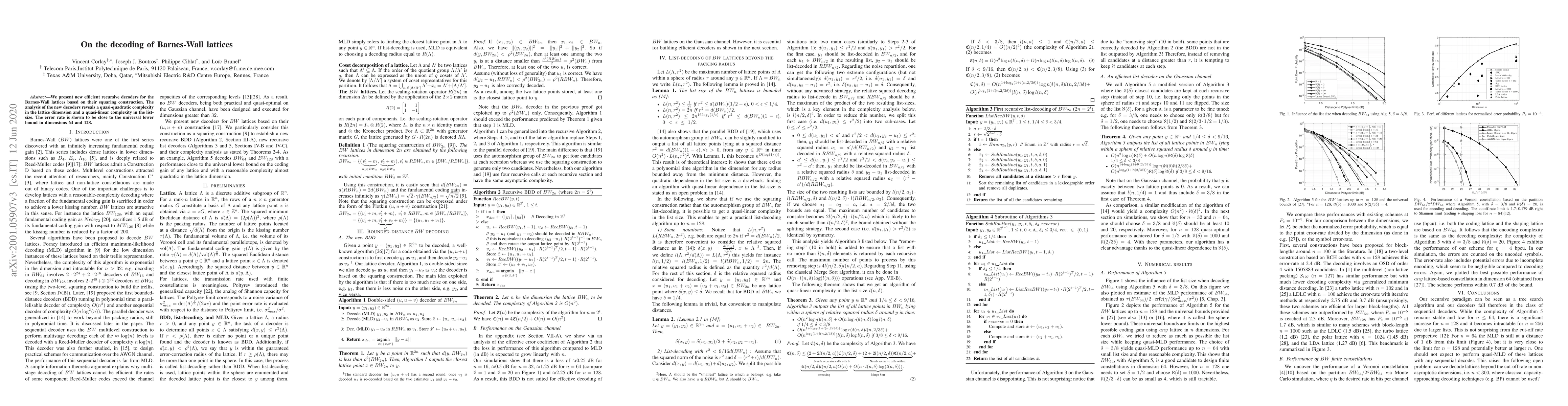 This paper introduces efficient recursive decoders for Barnes-Wall lattices using their squaring construction, achieving quasi-quadratic complexity in dimension and quasi-linear complexity in list-size, with error rates near the universal lower bound in dimensions 64 and 128.