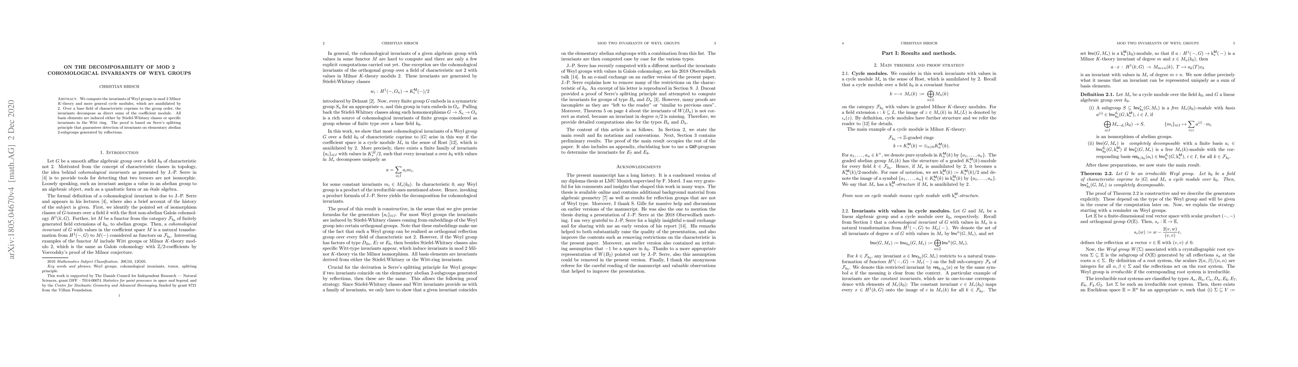 This paper computes mod 2 cohomological invariants of Weyl groups in Milnor K-theory and cycle modules, showing they decompose as direct sums of the coefficient module over fields with characteristic coprime to the group order. The proof leverages Serre's splitting principle to detect invariants linked to Stiefel-Whitney classes or Witt ring invariants.