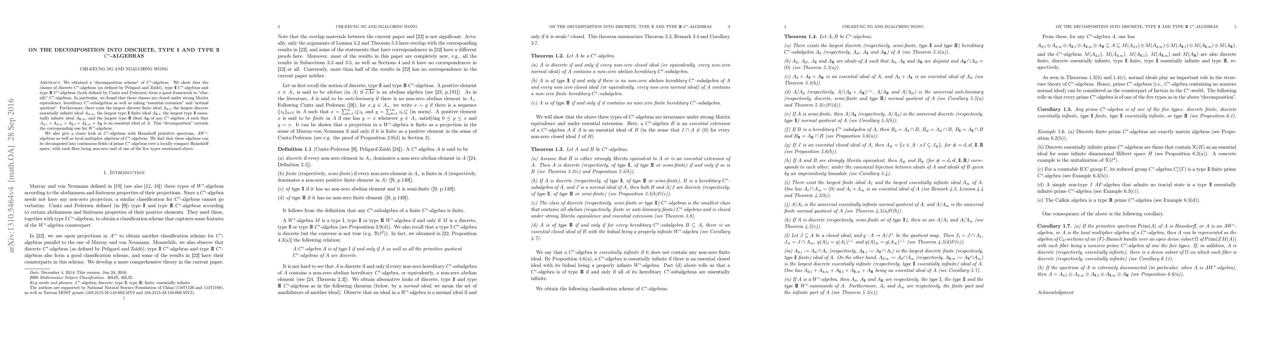 We obtained a "decomposition scheme" of C*-algebras. We show that the classes of discrete C*-algebras (as defined by Peligard and Zsido), type II C*-algebras and type III C*-algebras (both defined by Cuntz and Pedersen) form a good framework to "classify" C*-algebras. In particular, we found that these classes are closed under strong Morita equivalence, hereditary C*-subalgebras as well as taking "essential extension" and "normal quotient". Furthermore, there exist the largest discrete finite ideal $A_{d,1}$, the largest discrete essentially infinite ideal $A_{d,\infty}$, the largest type II finite ideal $A_{II,1}$, the largest type II essentially infinite ideal $A_{II,\infty}$, and the largest type III ideal $A_{III}$ of any C*-algebra $A$ such that $A_{d,1} + A_{d,\infty} + A_{II,1} + A_{II,\infty} + A_{III}$ is an essential ideal of $A$. This "decomposition" extends the corresponding one for $W^*$-algebras. We also give a closer look at C*-algebras with Hausdorff primitive spectrum, AW*-algebras as well as local multiplier algebras of C*-algebras. We find that these algebras can be decomposed into continuous fields of prime C*-algebras over a locally compact Hausdorff space, with each fiber being non-zero and of one of the five types mentioned above.