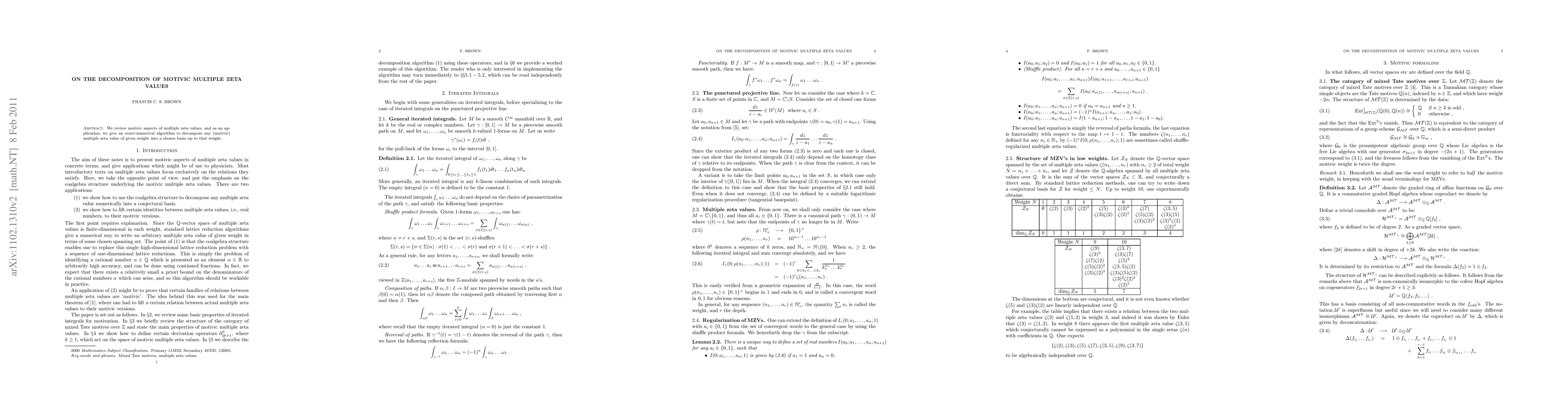 This paper examines the motivic properties of multiple zeta values and provides a precise numerical algorithm for decomposing any given motivic multiple zeta value into a basis of equivalent expressions up to a specified weight.