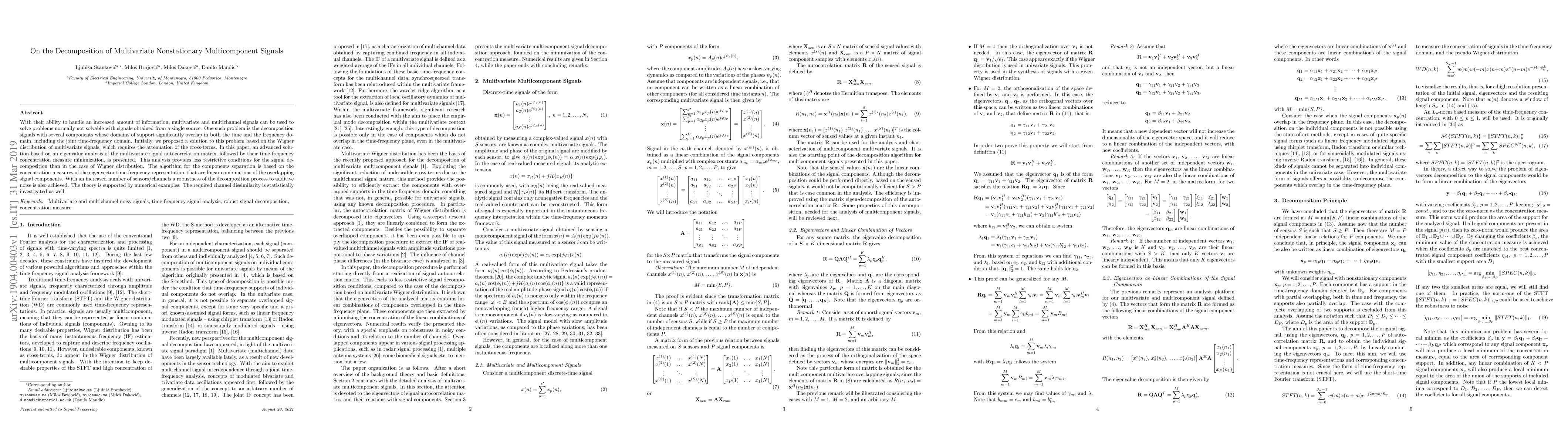This paper proposes an advanced method for decomposing multivariate nonstationary multicomponent signals using eigenvalue analysis of the signal autocorrelation matrix and minimization of time-frequency concentration measures, offering more robust conditions than the Wigner distribution method. The algorithm enhances robustness against additive noise with more sensors and is validated through numerical examples.