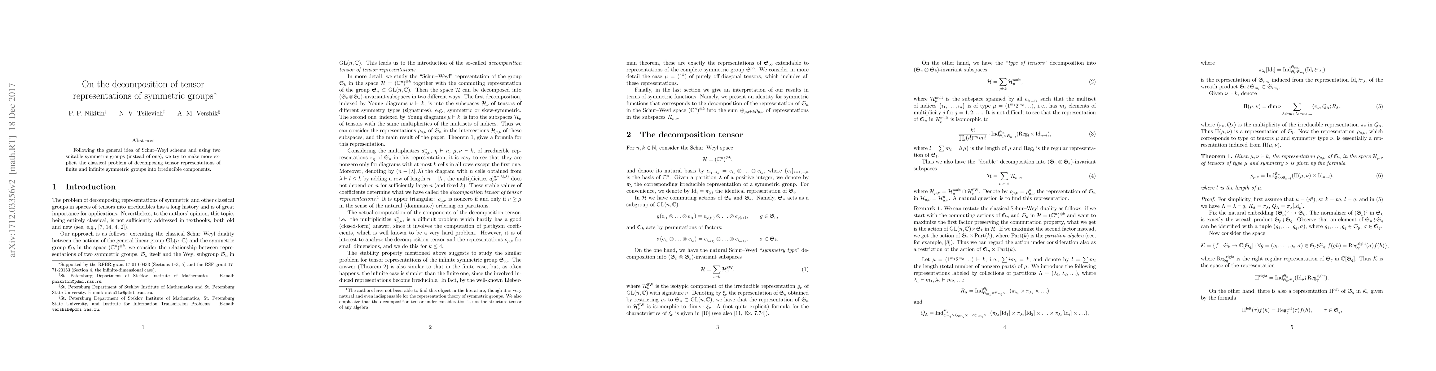 This paper explores the decomposition of tensor representations of symmetric groups using the Schur-Weyl scheme with two symmetric groups, aiming to provide a clearer understanding of the classical problem of breaking down these representations into irreducible components.