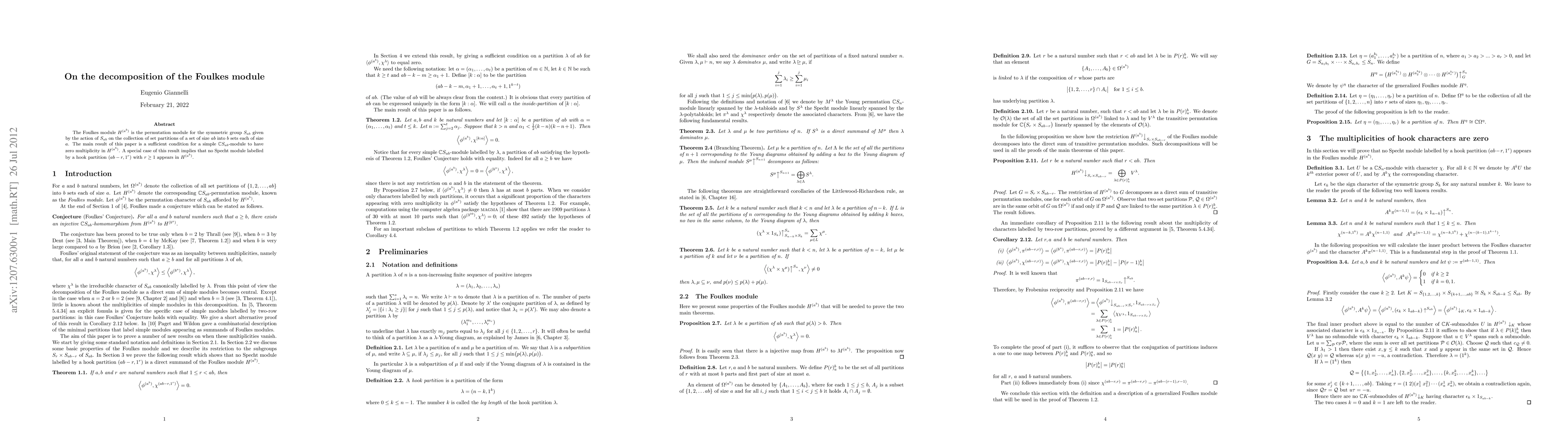 The Foulkes module H^(a^b) is the permutation module for the symmetric group S_ab given by the action of S_ab on the collection of set partitions of a set of size ab into b sets each of size a. The main result of this paper is a sufficient condition for a simple CS_{ab}-module to have zero multiplicity in H^(a^b). A special case of this result implies that no Specht module labelled by a hook partition (ab - r, 1^r) appears in H(a^b).