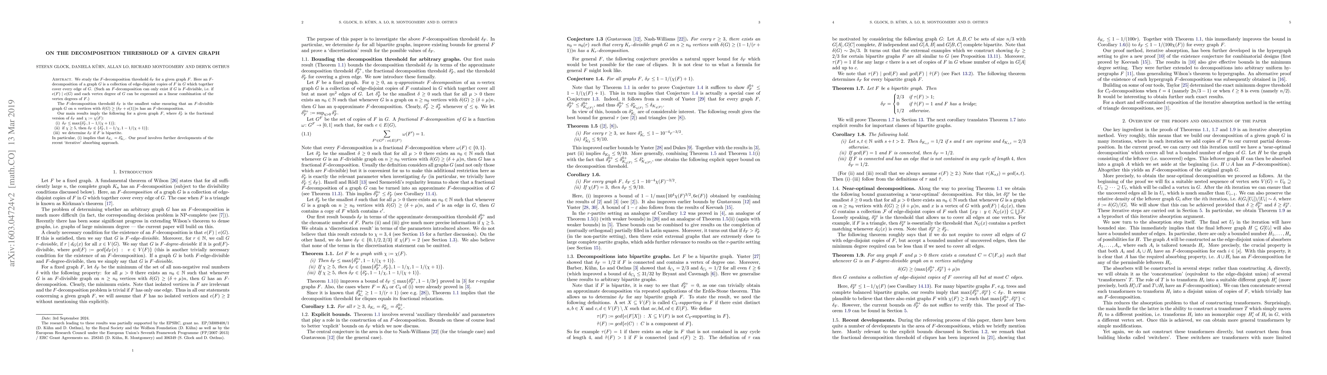 We study the $F$-decomposition threshold $\delta_F$ for a given graph $F$. Here an $F$-decomposition of a graph $G$ is a collection of edge-disjoint copies of $F$ in $G$ which together cover every edge of $G$. (Such an $F$-decomposition can only exist if $G$ is $F$-divisible, i.e. if $e(F)\mid e(G)$ and each vertex degree of $G$ can be expressed as a linear combination of the vertex degrees of $F$.) The $F$-decomposition threshold $\delta_F$ is the smallest value ensuring that an $F$-divisible graph $G$ on $n$ vertices with $\delta(G)\ge(\delta_F+o(1))n$ has an $F$-decomposition. Our main results imply the following for a given graph $F$, where $\delta_F^\ast$ is the fractional version of $\delta_F$ and $\chi:=\chi(F)$: (i) $\delta_F\le \max\{\delta_F^\ast,1-1/(\chi+1)\}$; (ii) if $\chi\ge 5$, then $\delta_F\in\{\delta_F^{\ast},1-1/\chi,1-1/(\chi+1)\}$; (iii) we determine $\delta_F$ if $F$ is bipartite. In particular, (i) implies that $\delta_{K_r}=\delta^\ast_{K_r}$. Our proof involves further developments of the recent `iterative' absorbing approach.