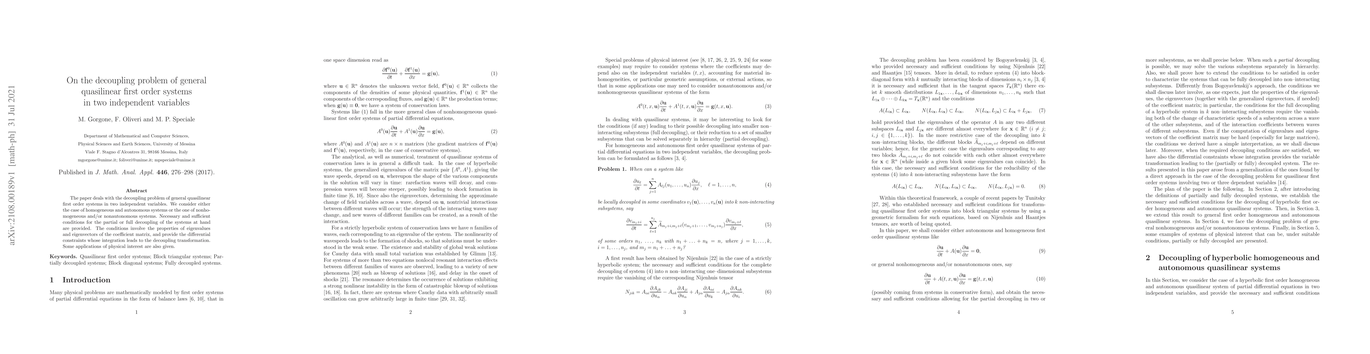 The paper provides necessary and sufficient conditions for decoupling general quasilinear first-order systems in two variables, focusing on homogeneous and autonomous cases. It also offers differential constraints that lead to the decoupling transformation, with applications of interest in physics.