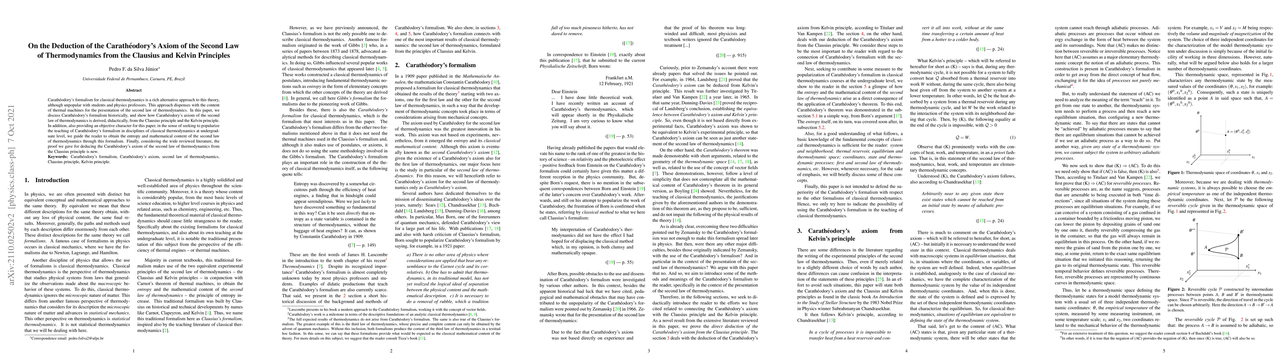 This paper explores the historical context of Carathéodory's formalism in classical thermodynamics and demonstrates how his axiom of the second law is derived from the Clausius and Kelvin principles. It aims to popularize this less-known approach and provides a new proof for the deduction, enhancing the teaching of thermodynamics at the undergraduate level.