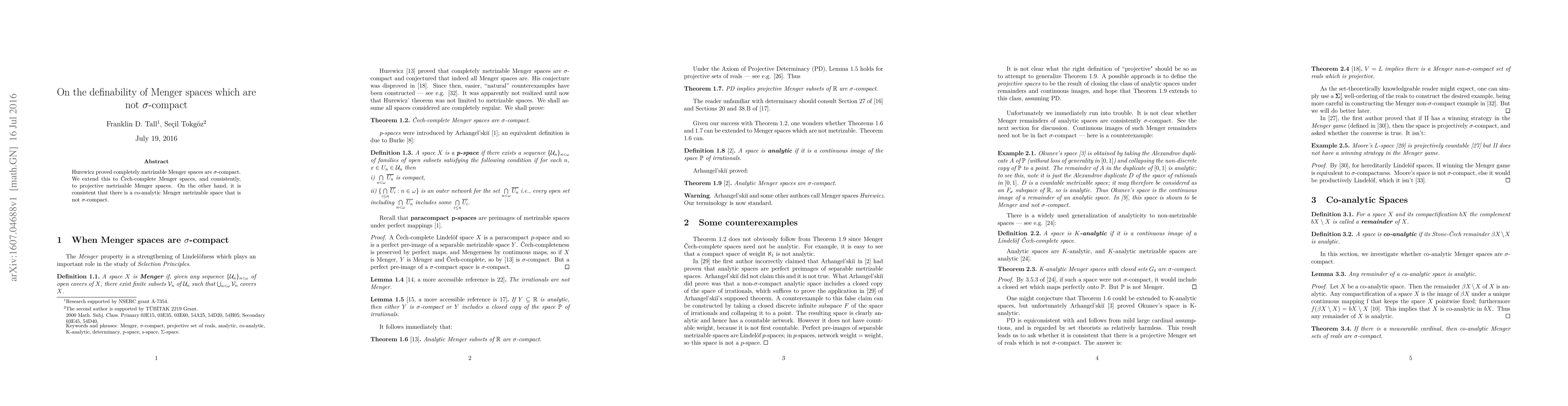 This paper extends Hurewicz's theorem on the /sigma-compactness of completely metrizable Menger spaces to Cech-complete and projective Menger spaces. Conversely, it demonstrates the consistency of the existence of a co-analytic Menger space that lacks /sigma-compactness.