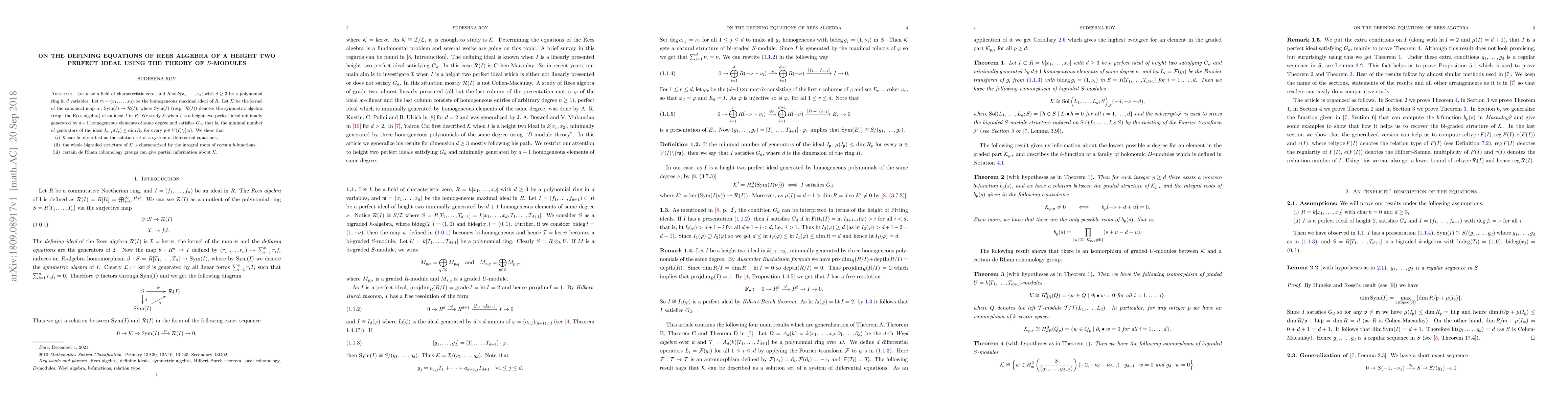 Let $k$ be a field of characteristic zero, and $R=k[x_1, \ldots, x_d]$ with $d \geq 3$ be a polynomial ring in $d$ variables. Let $\m=(x_1, \ldots, x_d)$ be the homogeneous maximal ideal of $R$. Let $\mathcal{K}$ be the kernel of the canonical map $\alpha: \sym(I) \rightarrow \R(I)$, where $\sym(I)$ (resp. $\R(I)$) denotes the symmetric algebra (resp. the Rees algebra) of an ideal $I$ in $R$. We study $\mathcal{K}$ when $I$ is a height two perfect ideal minimally generated by $d+1$ homogeneous elements of same degree and satisfies $G_d$, that is, the minimal number of generators of the ideal $I_{\mathfrak{p}}$, $\mu(I_{\mathfrak{p}}) \leq \dim R_{\mathfrak{p}}$ for every $\mathfrak{p} \in V(I) \backslash \{\m\}$. We show that \begin{enumerate}[{\rm (i)}] \item $\mathcal{K}$ can be described as the solution set of a system of differential equations, \item the whole bigraded structure of $\mathcal{K}$ is characterized by the integral roots of certain $b$-functions, \item certain de Rham cohomology groups can give partial information about $\mathcal{K}$. \end{enumerate}
