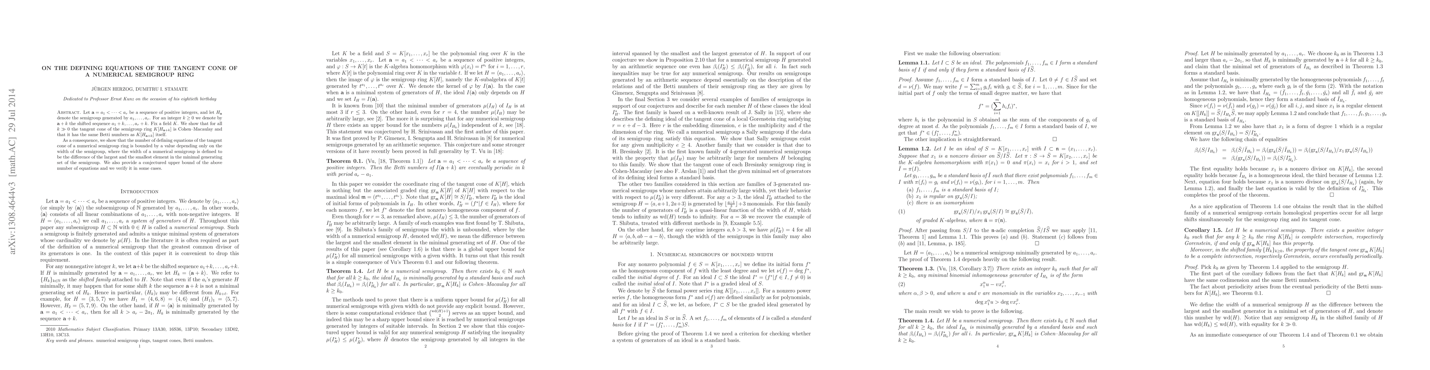This research establishes that for large enough shifts 'k' in a sequence of positive integers 'a', the associated graded ring of the semigroup ring is Cohen-Macaulay, sharing Betti numbers with K[H_a+k]. Consequently, it bounds the number of defining equations of the tangent cone of a numerical semigroup ring by a width-dependent value, also presenting a conjectured upper bound verified in certain cases.