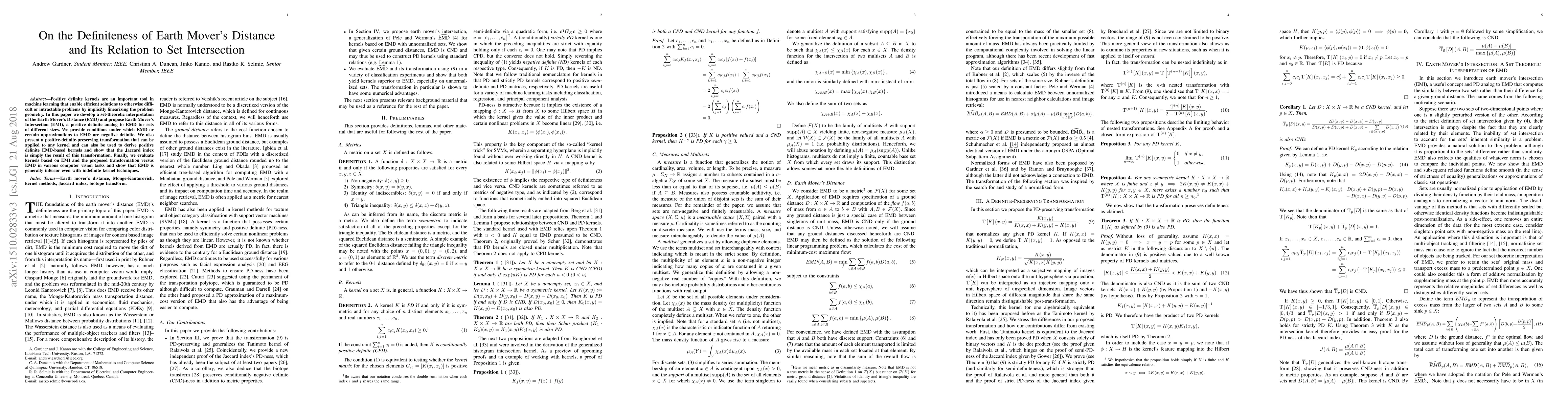 Positive definite kernels are an important tool in machine learning that enable efficient solutions to otherwise difficult or intractable problems by implicitly linearizing the problem geometry. In this paper we develop a set-theoretic interpretation of the Earth Mover's Distance (EMD) and propose Earth Mover's Intersection (EMI), a positive definite analog to EMD for sets of different sizes. We provide conditions under which EMD or certain approximations to EMD are negative definite. We also present a positive-definite-preserving transformation that can be applied to any kernel and can also be used to derive positive definite EMD-based kernels and show that the Jaccard index is simply the result of this transformation. Finally, we evaluate kernels based on EMI and the proposed transformation versus EMD in various computer vision tasks and show that EMD is generally inferior even with indefinite kernel techniques.