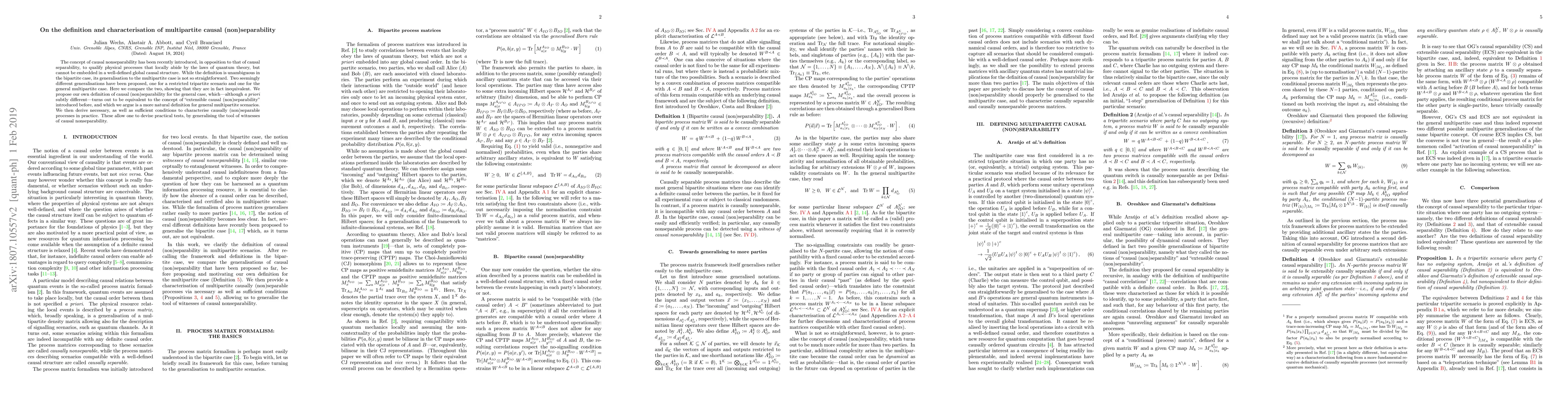 The concept of causal nonseparability has been recently introduced, in opposition to that of causal separability, to qualify physical processes that locally abide by the laws of quantum theory, but cannot be embedded in a well-defined global causal structure. While the definition is unambiguous in the bipartite case, its generalisation to the multipartite case is not so straightforward. Two seemingly different generalisations have been proposed, one for a restricted tripartite scenario and one for the general multipartite case. Here we compare the two, showing that they are in fact inequivalent. We propose our own definition of causal (non)separability for the general case, which---although a priori subtly different---turns out to be equivalent to the concept of "extensible causal (non)separability" introduced before, and which we argue is a more natural definition for general multipartite scenarios. We then derive necessary, as well as sufficient conditions to characterise causally (non)separable processes in practice. These allow one to devise practical tests, by generalising the tool of witnesses of causal nonseparability.
