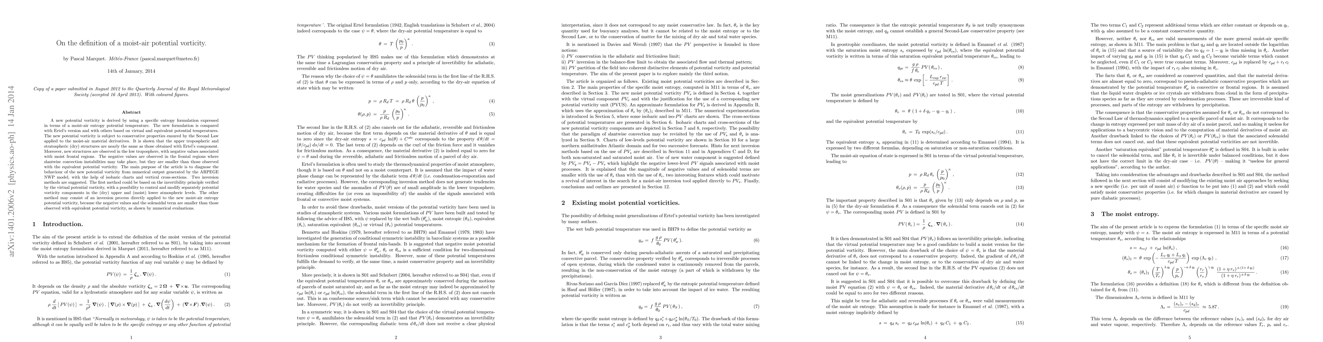 A new potential vorticity is derived by using a specific entropy formulation expressed in terms of a moist-air entropy potential temperature. The new formulation is compared with Ertel's version and with others based on virtual and equivalent potential temperatures. The new potential vorticity is subject to conservative properties ensured by the Second Law applied to the moist-air material derivatives. It is shown that the upper tropospheric and stratospheric (dry) structures are nearly the same as those obtained with Ertel's component. Moreover, new structures are observed in the low troposphere, with negative values associated with moist frontal regions. The negative values are observed in the frontal regions where slantwise convection instabilities may take place, but they are smaller than those observed with the equivalent potential vorticity. The main purpose of the article is to diagnose the behaviour of the new potential vorticity from numerical output generated by the ARPEGE NWP model, with the help of isobaric charts and vertical cross-sections. Two inversion methods are suggested. The first method could be based on the invertibility principle verified by the virtual potential vorticity, with a possibility to control and modify separately potential vorticity components in the (dry) upper and (moist) lower atmospheric levels. The other method may consist of an inversion process directly applied to the new moist-air entropy potential vorticity, because the negative values and the solenoidal term are smaller than those observed with equivalent potential vorticity, as shown by numerical evaluations.