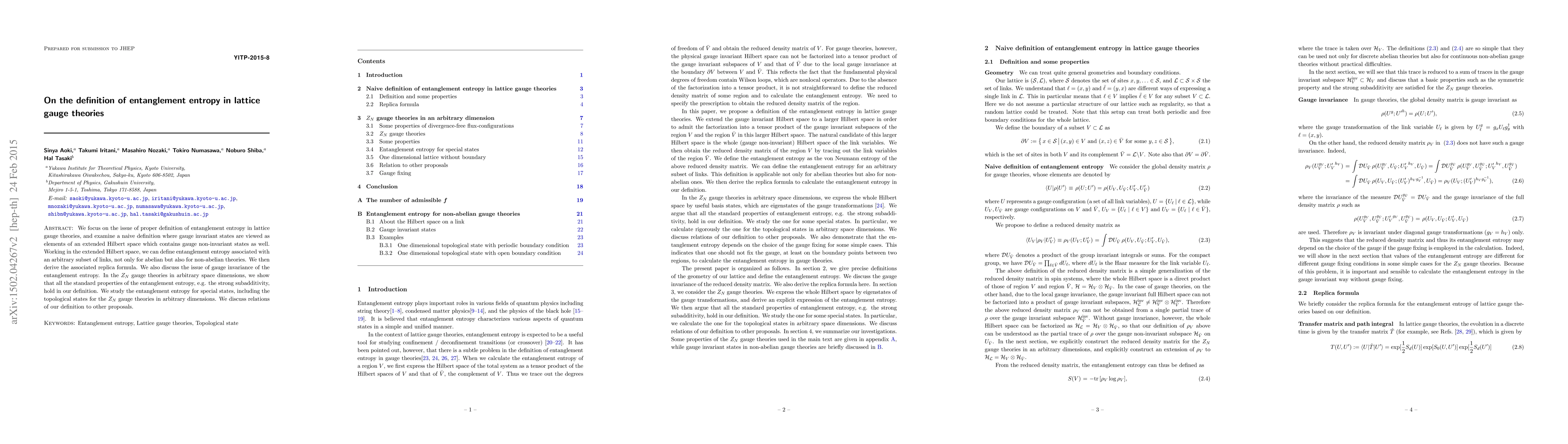 This paper proposes a definition of entanglement entropy in lattice gauge theories by extending the Hilbert space to include gauge non-invariant states. The authors derive the replica formula and demonstrate that their definition maintains standard properties like strong subadditivity, applicable to both abelian and non-abelian theories.