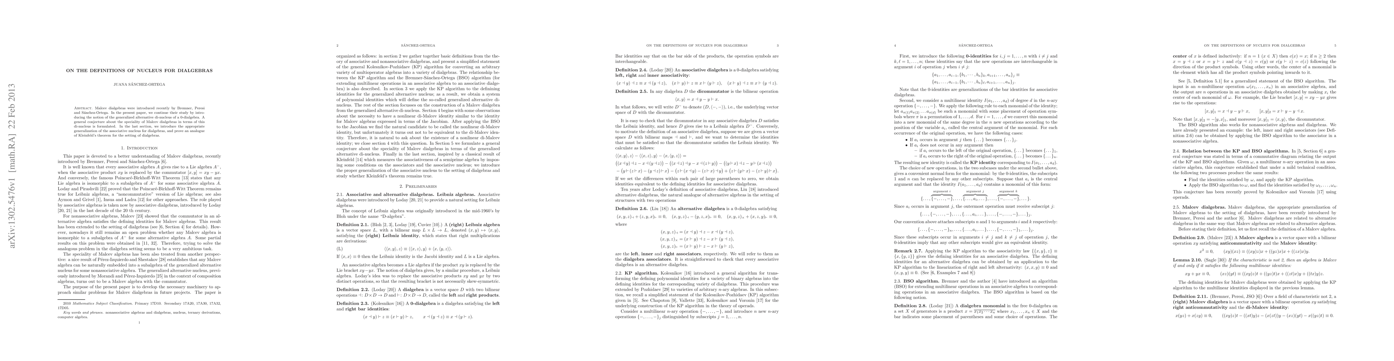 This paper introduces the concept of a generalized alternative di-nucleus for 0-dialgebras and formulates a conjecture regarding the speciality of Malcev dialgebras in this context. It also generalizes the associative nucleus for dialgebras and proves an analogue of Kleinfeld's theorem for the dialgebra setting.
