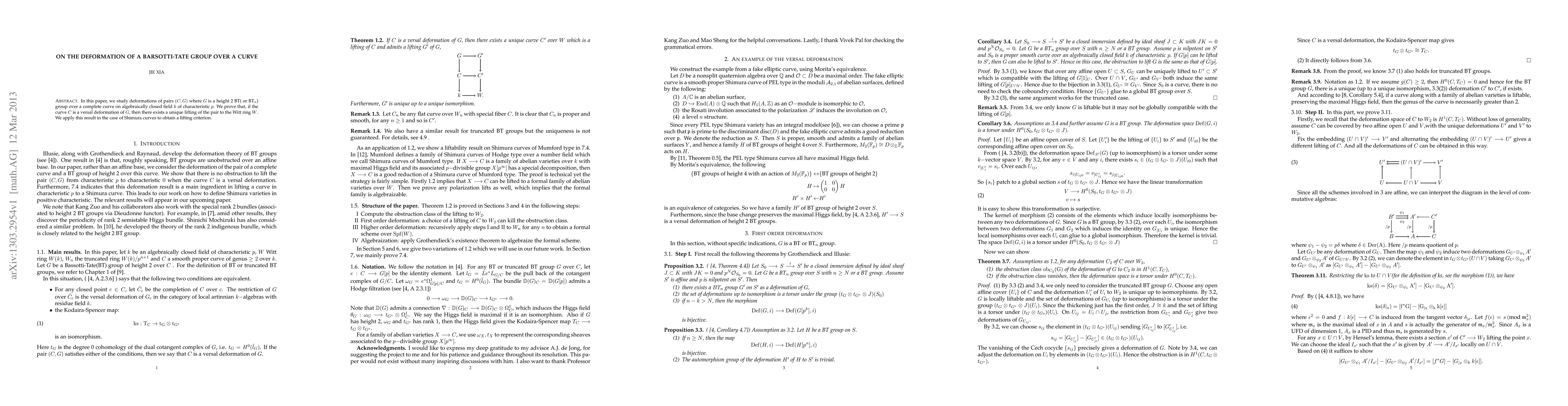 In this paper, we study deformations of pairs (C,G) where G is a height 2 BT(or BT_n) group over a complete curve on algebraically closed field k of characteristic p. We prove that, if the curve C is a versal deformation of G, then there exists a unique lifting of the pair to the Witt ring W. We apply this result in the case of Shimura curves to obtain a lifting criterion.