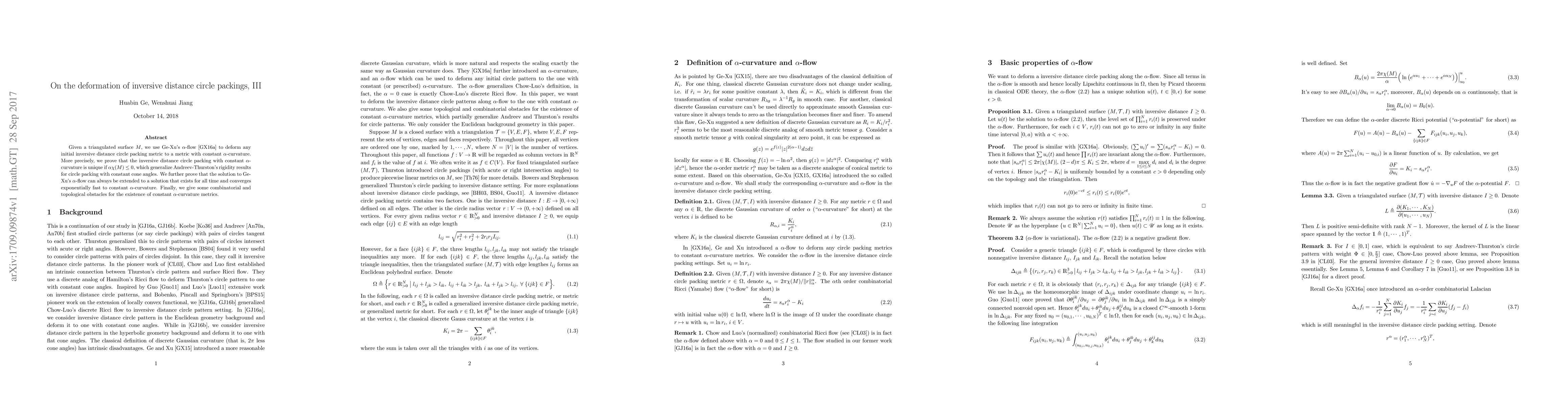 Given a triangulated surface $M$, we use Ge-Xu's $\alpha$-flow \cite{Ge-Xu1} to deform any initial inversive distance circle packing metric to a metric with constant $\alpha$-curvature. More precisely, we prove that the inversive distance circle packing with constant $\alpha$-curvature is unique if $\alpha\chi(M)\leq 0$, which generalize Andreev-Thurston's rigidity results for circle packing with constant cone angles. We further prove that the solution to Ge-Xu's $\alpha$-flow can always be extended to a solution that exists for all time and converges exponentially fast to constant $\alpha$-curvature. Finally, we give some combinatorial and topological obstacles for the existence of constant $\alpha$-curvature metrics.