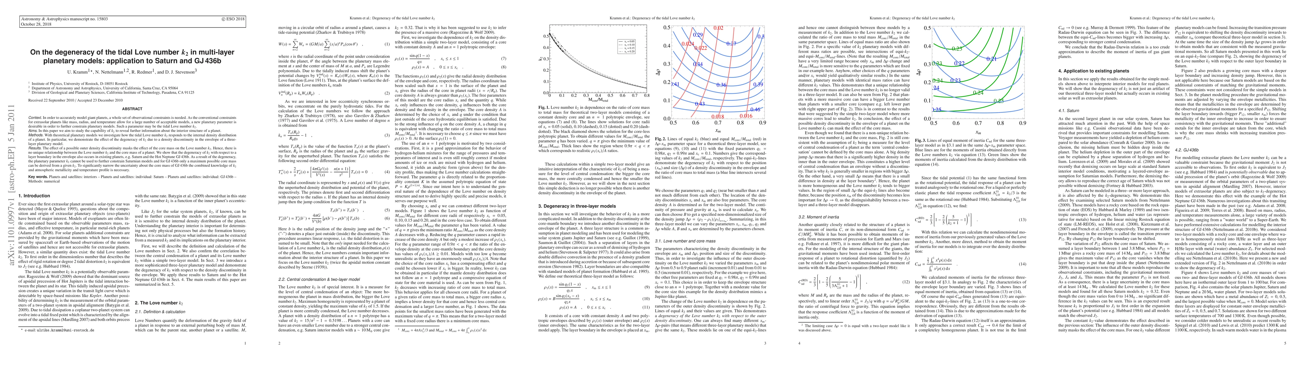 In order to accurately model giant planets, a whole set of observational constraints is needed. As the conventional constraints for extrasolar planets like mass, radius, and temperature allow for a large number of acceptable models, a new planetary parameter is desirable in order to further constrain planetary models. Such a parameter may be the tidal Love number k2. In this paper we aim to study the capability of k2 to reveal further information about the interior structure of a planet. With theoretical planetary models we investigate how the tidal Love number k2 responds to the internal density distribution of a planet. In particular, we demonstrate the effect of the degeneracy of k2 due to a density discontinuity in the envelope of a three-layer planetary model. The effect of a possible outer density discontinuity masks the effect of the core mass on the Love number k2. Hence, there is no unique relationship between the Love number k2 and the core mass of a planet. We show that the degeneracy of k2 with respect to a layer boundary in the envelope also occurs in existing planets, e.g. Saturn and the Hot Neptune GJ436b. As a result of the degeneracy, the planetary parameter k2 cannot be used to further constrain Saturnian models and for GJ436b only a maximum possible core mass can be derived from a given k2. To significantly narrow the uncertainty about the core mass of GJ436b the combined knowledge of k2 and atmospheric metallicity and temperature profile is necessary.