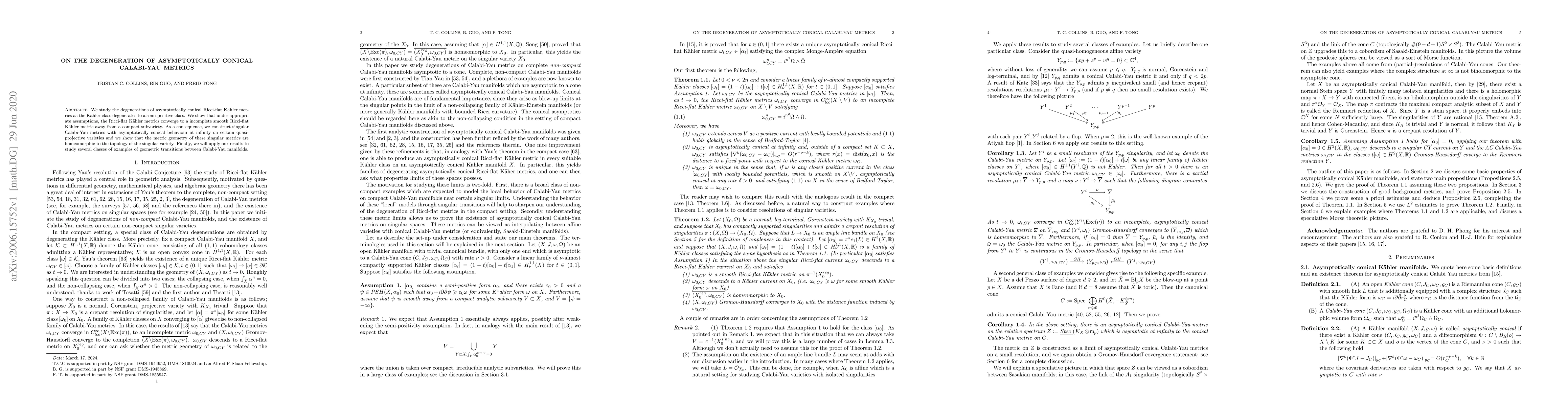 We study the degenerations of asymptotically conical Ricci-flat K\"ahler metrics as the K\"ahler class degenerates to a semi-positive class. We show that under appropriate assumptions, the Ricci-flat K\"ahler metrics converge to a incomplete smooth Ricci-flat K\"ahler metric away from a compact subvariety. As a consequence, we construct singular Calabi-Yau metrics with asymptotically conical behaviour at infinity on certain quasi-projective varieties and we show that the metric geometry of these singular metrics are homeomorphic to the topology of the singular variety. Finally, we will apply our results to study several classes of examples of geometric transitions between Calabi-Yau manifolds.
