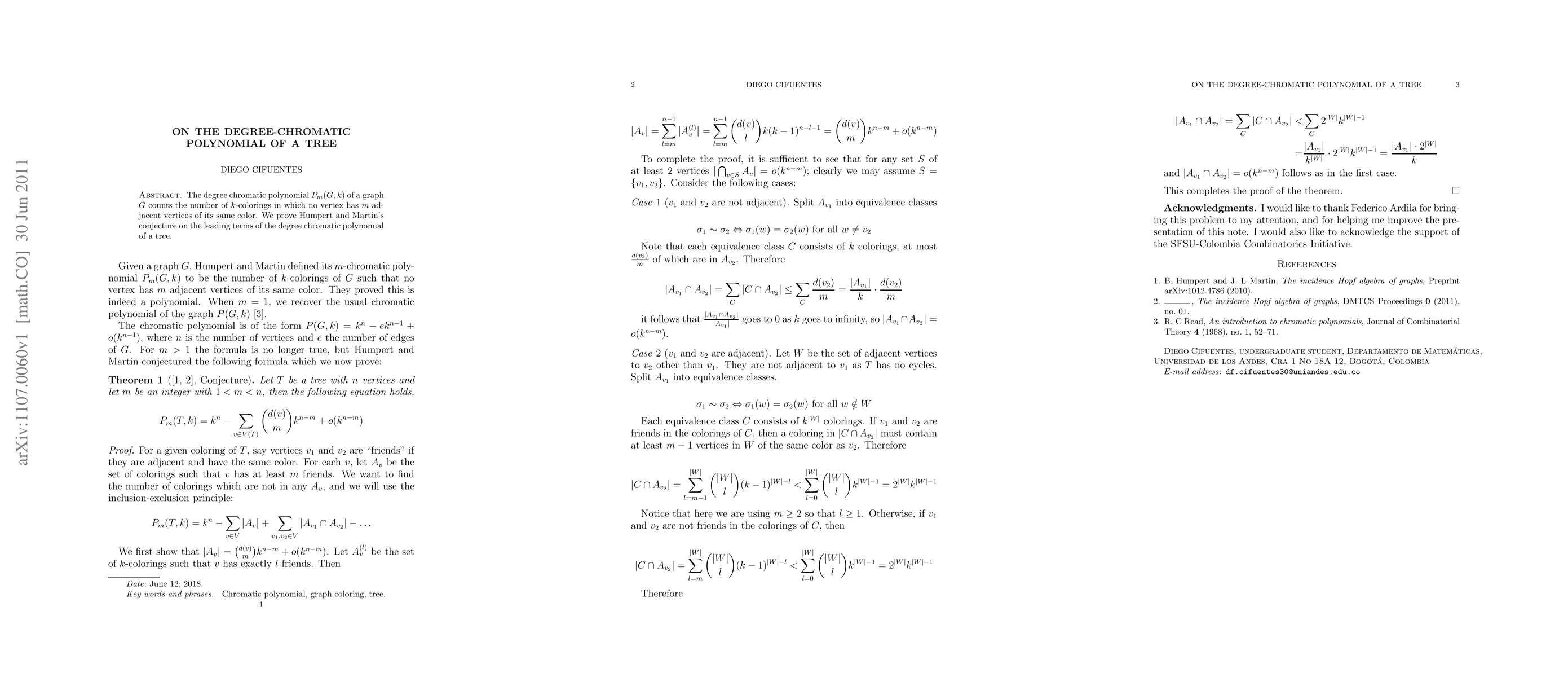 The degree chromatic polynomial $Pm(G,k)$ of a graph $G$ counts the number of $k$-colorings in which no vertex has $m$ adjacent vertices of its same color. We prove Humpert and Martin's conjecture on the leading terms of the degree chromatic polynomial of a tree.