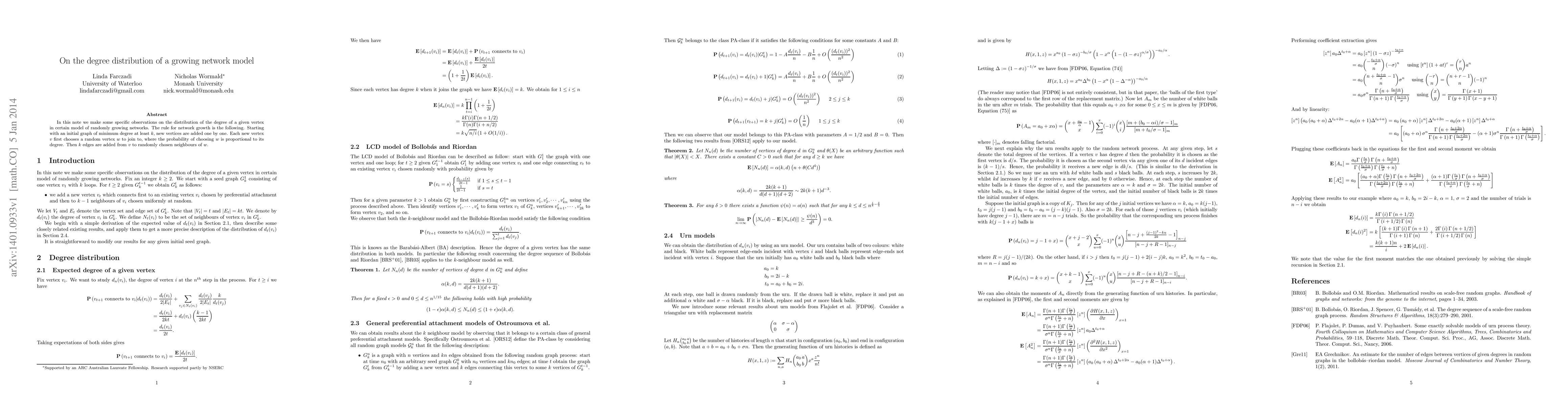 Summary: This paper examines the degree distribution in a growing network model where new vertices preferentially attach to higher-degree nodes, leading to a specific pattern of degree distribution as the network expands. The model starts with a base graph of minimum degree $k$ and adds new vertices by connecting to existing nodes based on their degree.