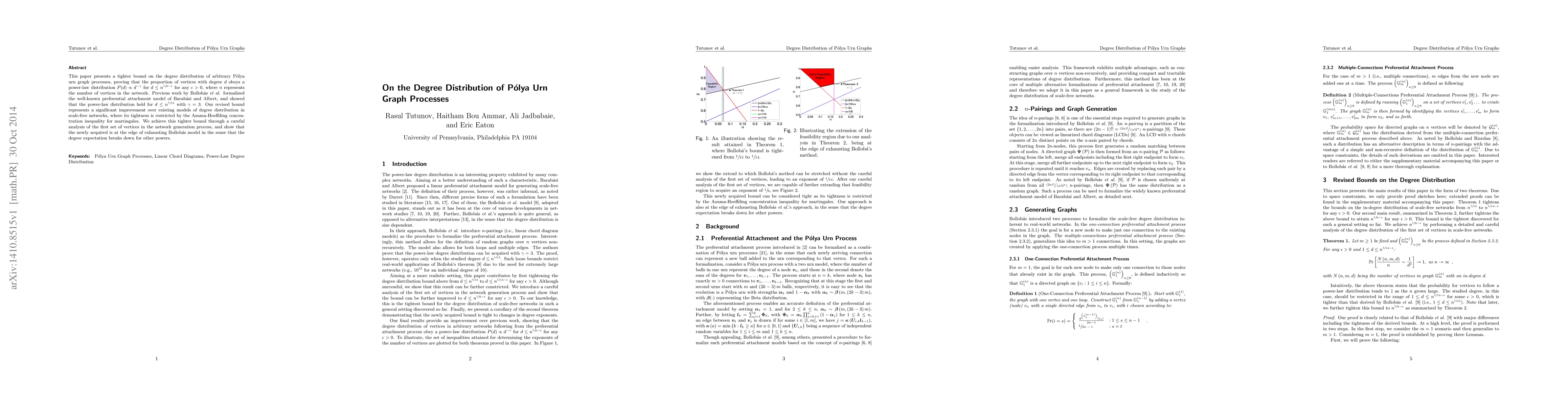 This paper presents a tighter bound on the degree distribution of arbitrary P\'{o}lya urn graph processes, proving that the proportion of vertices with degree $d$ obeys a power-law distribution $P(d) \propto d^{-\gamma}$ for $d \leq n^{\frac{1}{6}-\epsilon}$ for any $\epsilon > 0$, where $n$ represents the number of vertices in the network. Previous work by Bollob\'{a}s et al. formalized the well-known preferential attachment model of Barab\'{a}si and Albert, and showed that the power-law distribution held for $d \leq n^{\frac{1}{15}}$ with $\gamma = 3$. Our revised bound represents a significant improvement over existing models of degree distribution in scale-free networks, where its tightness is restricted by the Azuma-Hoeffding concentration inequality for martingales. We achieve this tighter bound through a careful analysis of the first set of vertices in the network generation process, and show that the newly acquired is at the edge of exhausting Bollob\'as model in the sense that the degree expectation breaks down for other powers.
