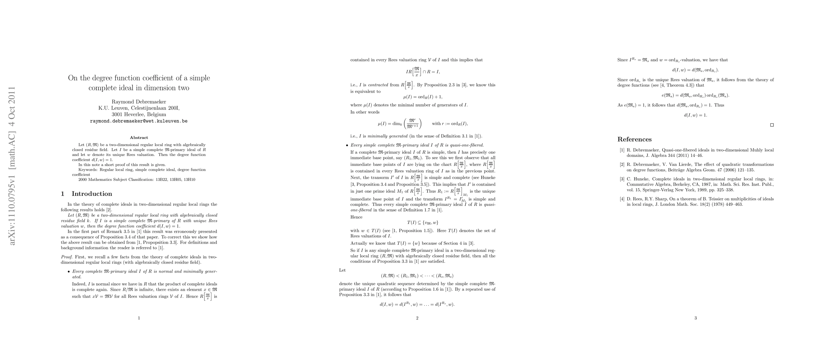 Let $(R,\mathfrak{M})$ be a two-dimensional regular local ring with algebraically closed residue field. Let $I$ be a simple complete $\mathfrak{M}$-primary ideal of $R$ and let $w$ denote its unique Rees valuation. Then the degree function coefficient $d(I,w)=1$. In this note a short proof of this result is given.