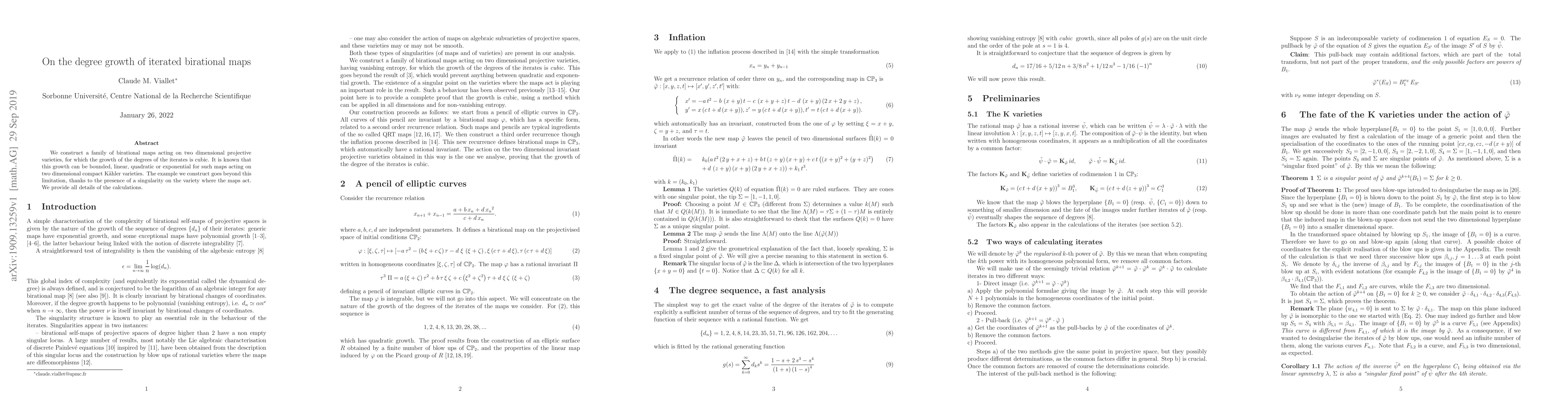 We construct a family of birational maps acting on two dimensional projective varieties, for which the growth of the degrees of the iterates is cubic. It is known that this growth can be bounded, linear, quadratic or exponential for such maps acting on two dimensional compact K\"ahler varieties. The example we construct goes beyond this limitation, thanks to the presence of a singularity on the variety where the maps act. We provide all details of the calculations.