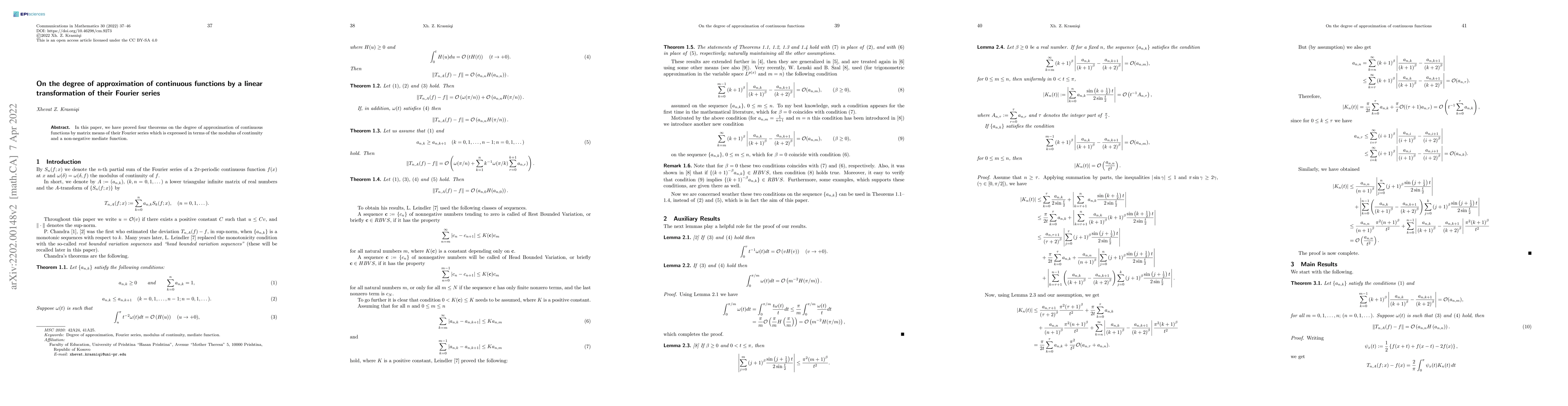 Summary: This paper proves four theorems regarding the approximation of continuous functions using matrix means of their Fourier series, linking the approximation degree to the modulus of continuity and a non-negative mediate function.