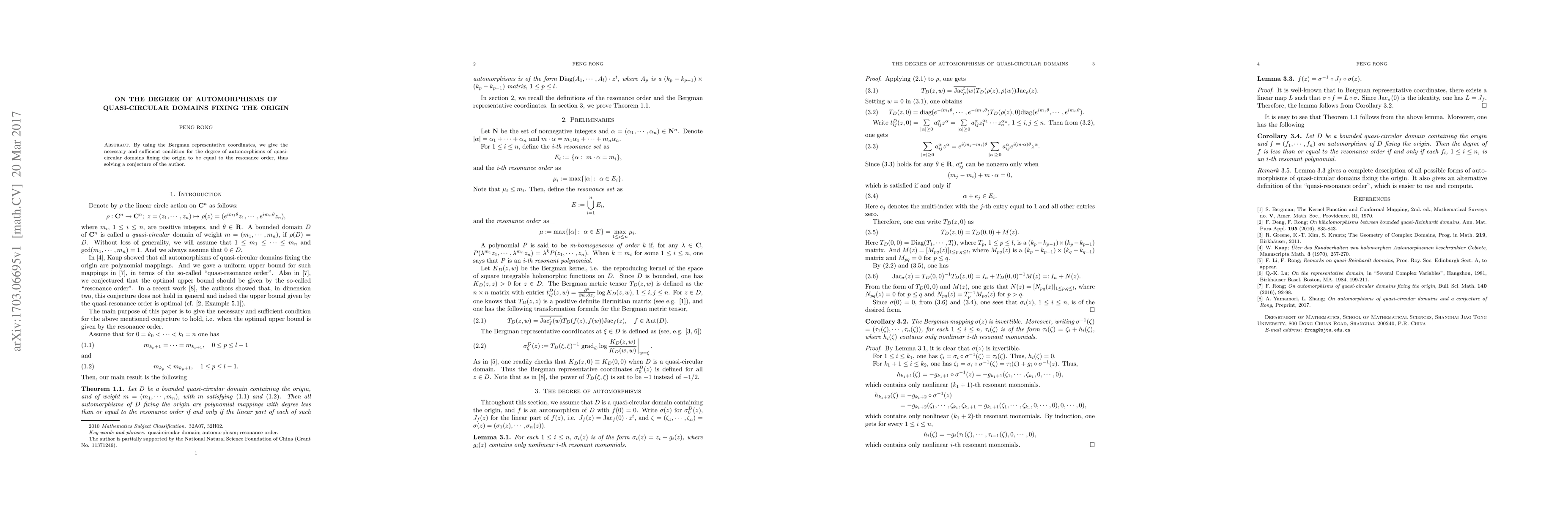 Summary: This paper establishes the necessary and sufficient condition for the degree of automorphisms of quasi-circular domains fixing the origin to match the resonance order, thereby solving a conjecture using Bergman representative coordinates.