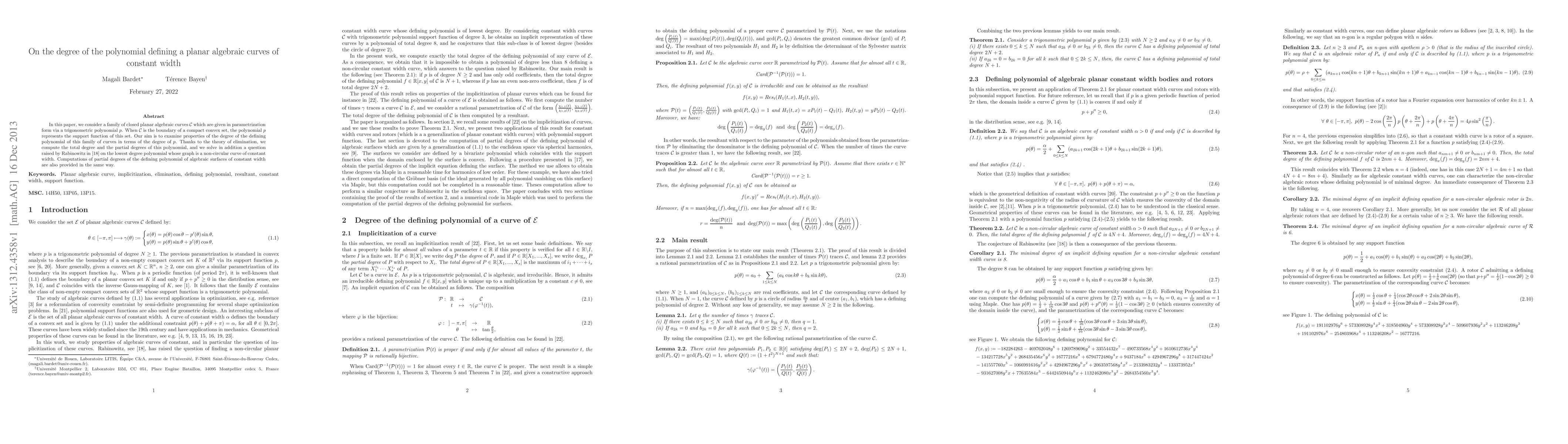 In this paper, we consider a family of closed planar algebraic curves $\mathcal{C}$ which are given in parametrization form via a trigonometric polynomial $p$. When $\mathcal{C}$ is the boundary of a compact convex set, the polynomial $p$ represents the support function of this set. Our aim is to examine properties of the degree of the defining polynomial of this family of curves in terms of the degree of $p$. Thanks to the theory of elimination, we compute the total degree and the partial degrees of this polynomial, and we solve in addition a question raised by Rabinowitz in \cite{Rabi} on the lowest degree polynomial whose graph is a non-circular curve of constant width. Computations of partial degrees of the defining polynomial of algebraic surfaces of constant width are also provided in the same way.