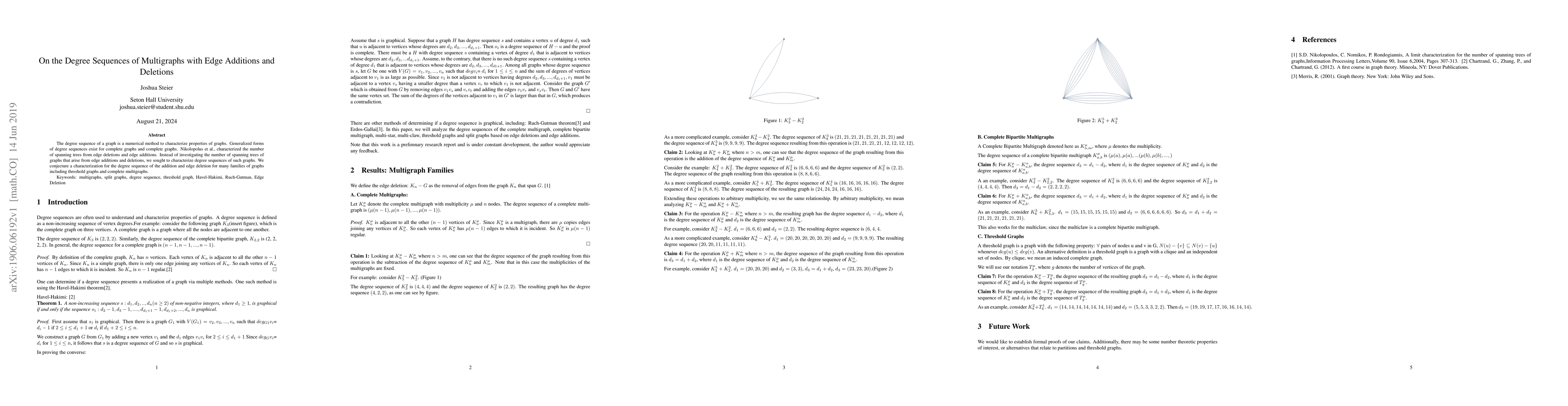 This paper explores the degree sequences of multigraphs formed through edge additions and deletions, aiming to characterize these sequences for various graph families, including threshold graphs and complete multigraphs, building on previous work by Nikolopolus et al. on spanning trees. Keywords include multigraphs, split graphs, degree sequence, threshold graph, Havel-Hakimi, Ruch-Gutman, and edge deletion.