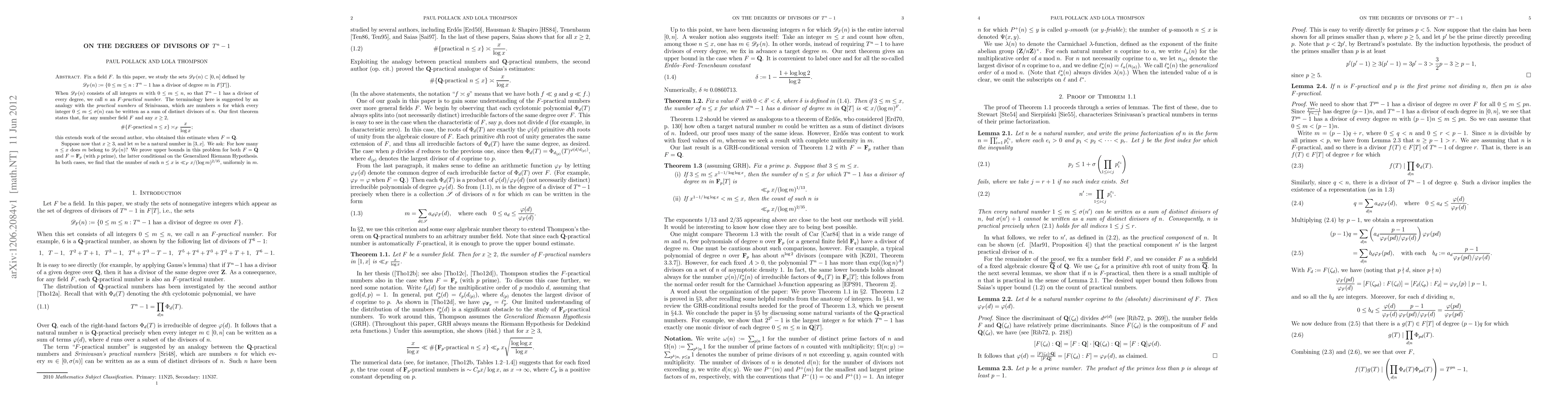A paper studies the degrees of divisors of polynomials of the form $T^n-1$, focusing on practical numbers where every degree divisor is present. It finds that for certain fields, the number of such polynomials with a specific divisor is proportional to $rac{x}{ ext{degree}^{2/35}}$.