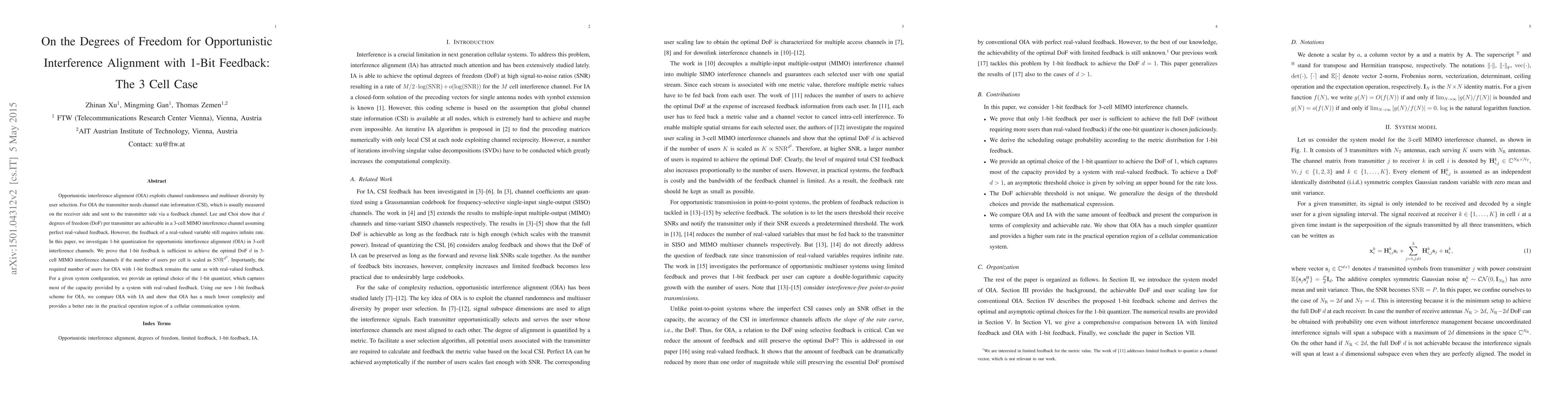 Opportunistic interference alignment (OIA) exploits channel randomness and multiuser diversity by user selection. For OIA the transmitter needs channel state information (CSI), which is usually measured on the receiver side and sent to the transmitter side via a feedback channel. Lee and Choi show that $d$ degrees of freedom (DoF) per transmitter are achievable in a 3-cell MIMO interference channel assuming perfect real-valued feedback. However, the feedback of a real-valued variable still requires infinite rate. In this paper, we investigate 1-bit quantization for opportunistic interference alignment (OIA) in 3-cell interference channels. We prove that 1-bit feedback is sufficient to achieve the optimal DoF $d$ in 3-cell MIMO interference channels if the number of users per cell is scaled as ${\rm SNR}^{d^2}$. Importantly, the required number of users for OIA with 1-bit feedback remains the same as with real-valued feedback. For a given system configuration, we provide an optimal choice of the 1-bit quantizer, which captures most of the capacity provided by a system with real-valued feedback. Using our new 1-bit feedback scheme for OIA, we compare OIA with IA and show that OIA has a much lower complexity and provides a better rate in the practical operation region of a cellular communication system.