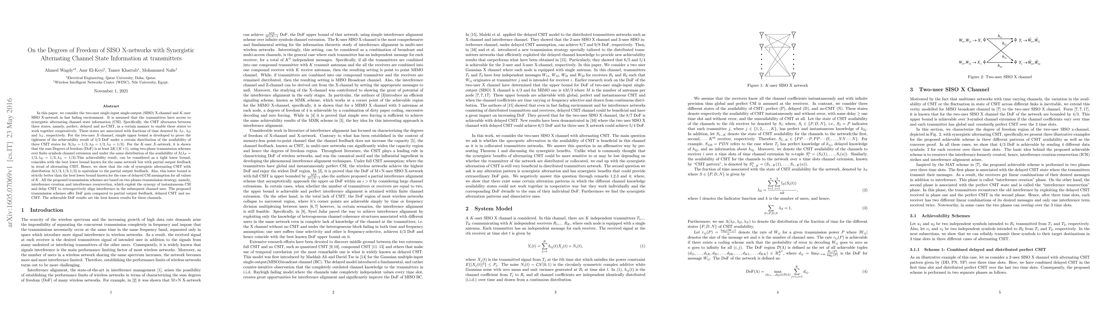 In this paper, we consider the two-user single-input single-output (SISO) X-channel and $K$-user SISO X-network in fast fading environment. It is assumed that the transmitters have access to synergistic alternating channel state information (CSI). Specifically, the CSIT alternates between three states, namely, perfect, delayed and no-CSIT, in a certain manner to enable these states to work together cooperatively. These states are associated with fractions of time denoted by $\lambda_P$, $\lambda_D$ \text{and} $\lambda_N$, respectively. For the two-user $X$-channel, simple upper bound is developed to prove the tightness of the achievability result of $4/3$ DoF under a certain distribution of the availability of three CSIT states for $\Lambda(\lambda_P=1/3, \lambda_D= 1/3, \lambda_N=1/3)$. For the $K$-user $X$-network, it is shown that the sum Degrees of freedom (DoF) is at least $2K/(K + 1)$, using two-phase transmission schemes over finite symbols channel extension and under the same distribution of the availability of $\Lambda(\lambda_P=1/3, \lambda_D= 1/3, \lambda_N=1/3)$.This achievability result, can be considered as a tight lower bound, coincides with the best lower bound known for the same network but with partial output feedback in stead of alternating CSIT. Hence, we show that the role of synergistic alternating CSIT with distribution $\Lambda(1/3,1/3,1/3)$ is equivalent to the partial output feedback. Also, this lower bound is strictly better than the best lower bound known for the case of delayed CSI assumption for all values of $K$. All the proposed transmission schemes are based on two phases transmission strategy, namely, interference creation and interference resurrection, which exploit the synergy of instantaneous CSI and delay CSIT to retrospectively align interference in the subsequent channel uses.