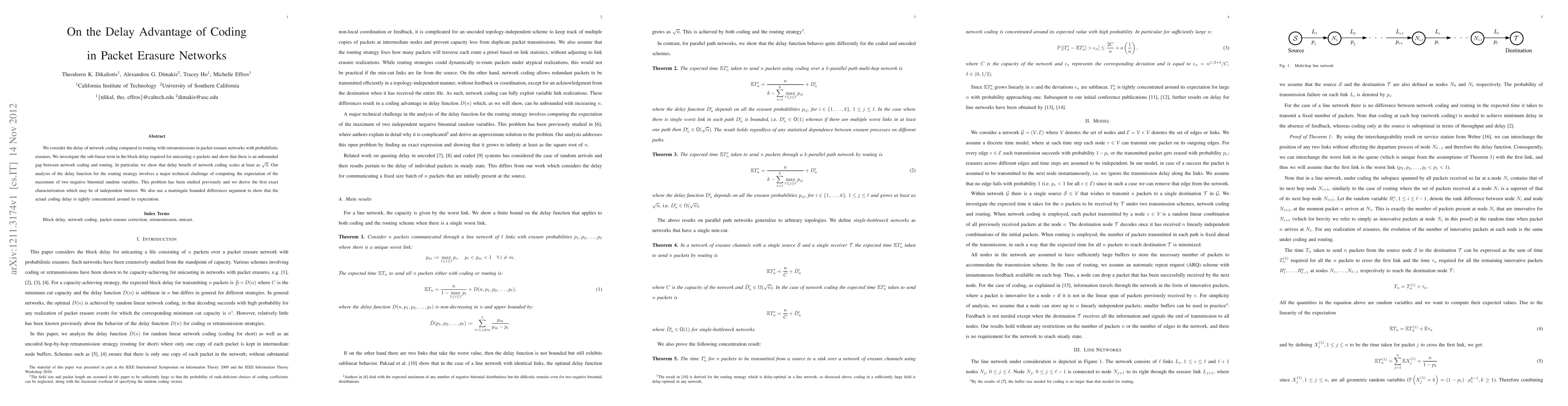 This paper investigates the delay performance of network coding versus routing with retransmissions in packet erasure networks, demonstrating that network coding offers a delay advantage scaling at least as $\sqrt{n}$ for unicasting $n$ packets. The study resolves a technical challenge in computing the expectation of the maximum of two negative binomial random variables, providing an exact characterization.