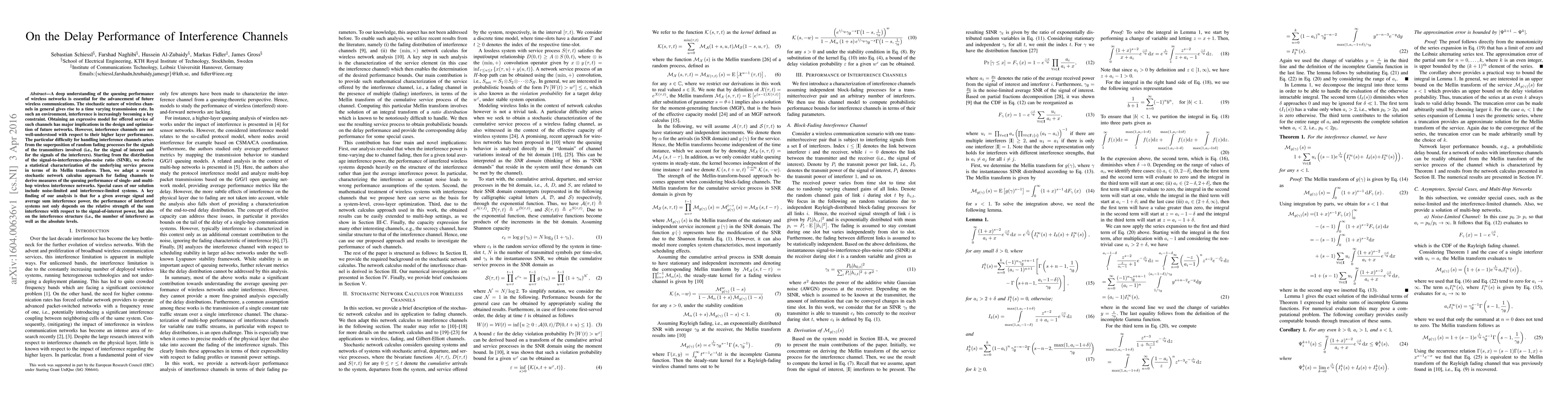 A deep understanding of the queuing performance of wireless networks is essential for the advancement of future wireless communications. The stochastic nature of wireless channels in general gives rise to a time varying transmission rate. In such an environment, interference is increasingly becoming a key constraint. Obtaining an expressive model for offered service of such channels has major implications in the design and optimization of future networks. However, interference channels are not well-understood with respect to their higher layer performance. The particular difficulty for handling interference channels arises from the superposition of random fading processes for the signals of the transmitters involved (i.e., for the signal of interest and for the signals of the interferers). Starting from the distribution of the signal-to-interference-plus-noise ratio (SINR), we derive a statistical characterization of the underlying service process in terms of its Mellin transform. Then, we adapt a recent stochastic network calculus approach for fading channels to derive measures of the queuing performance of single- and multi-hop wireless interference networks. Special cases of our solution include noise-limited and interference-limited systems. A key finding of our analysis is that for a given average signal and average sum interference power, the performance of interfered systems not only depends on the relative strength of the sum interference with respect to the signal-of-interest power, but also on the interference structure (i.e., the number of interferers) as well as the absolute levels.
