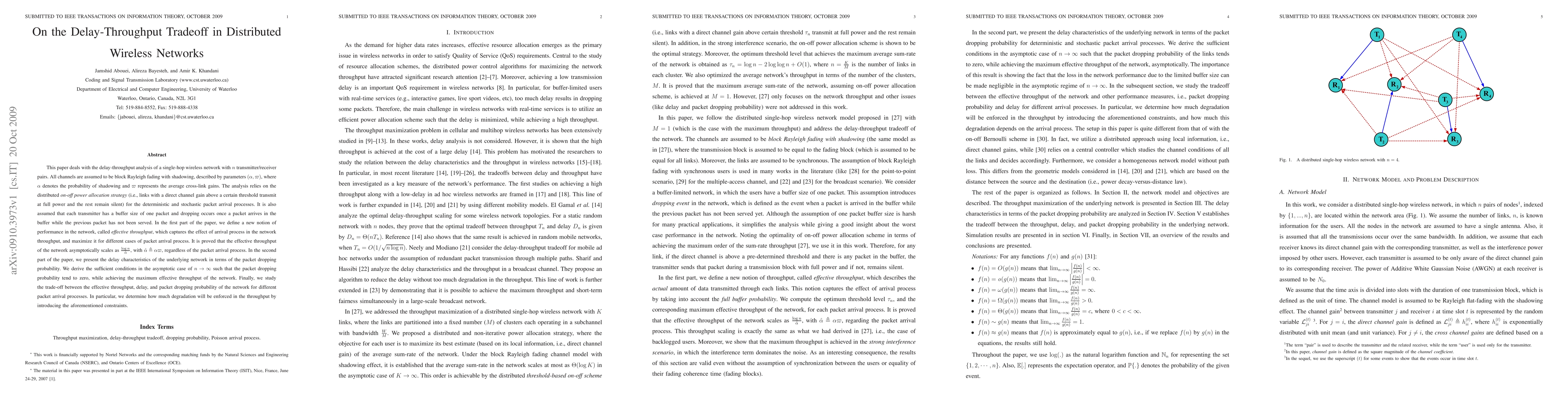 This paper deals with the delay-throughput analysis of a single-hop wireless network with $n$ transmitter/receiver pairs. All channels are assumed to be block Rayleigh fading with shadowing, described by parameters $(\alpha,\varpi)$, where $\alpha$ denotes the probability of shadowing and $\varpi$ represents the average cross-link gains. The analysis relies on the distributed on-off power allocation strategy (i.e., links with a direct channel gain above a certain threshold transmit at full power and the rest remain silent) for the deterministic and stochastic packet arrival processes. It is also assumed that each transmitter has a buffer size of one packet and dropping occurs once a packet arrives in the buffer while the previous packet has not been served. In the first part of the paper, we define a new notion of performance in the network, called effective throughput, which captures the effect of arrival process in the network throughput, and maximize it for different cases of packet arrival process. It is proved that the effective throughput of the network asymptotically scales as $\frac{\log n}{\hat{\alpha}}$, with $\hat{\alpha} \triangleq \alpha \varpi$, regardless of the packet arrival process. In the second part of the paper, we present the delay characteristics of the underlying network in terms of the packet dropping probability. We derive the sufficient conditions in the asymptotic case of $n \to \infty$ such that the packet dropping probability tend to zero, while achieving the maximum effective throughput of the network. Finally, we study the trade-off between the effective throughput, delay, and packet dropping probability of the network for different packet arrival processes.