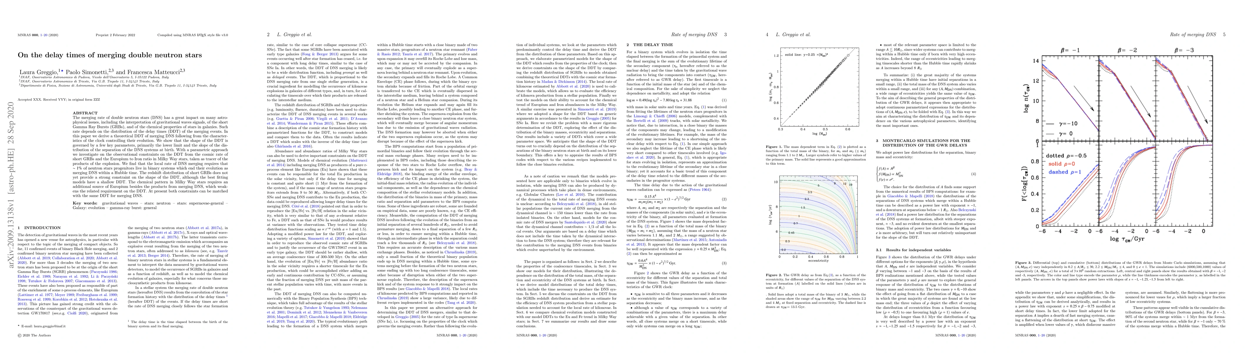 Researchers developed a theoretical model for the delay times of merging double neutron stars, finding that about 1% of neutron star progenitors form binary systems that merge within a Hubble time. The local rate of DNS merging requires a specific shape of the distribution of delay times, which can be matched with current constraints from short Gamma Ray Bursts and chemical patterns in Milky Way stars.