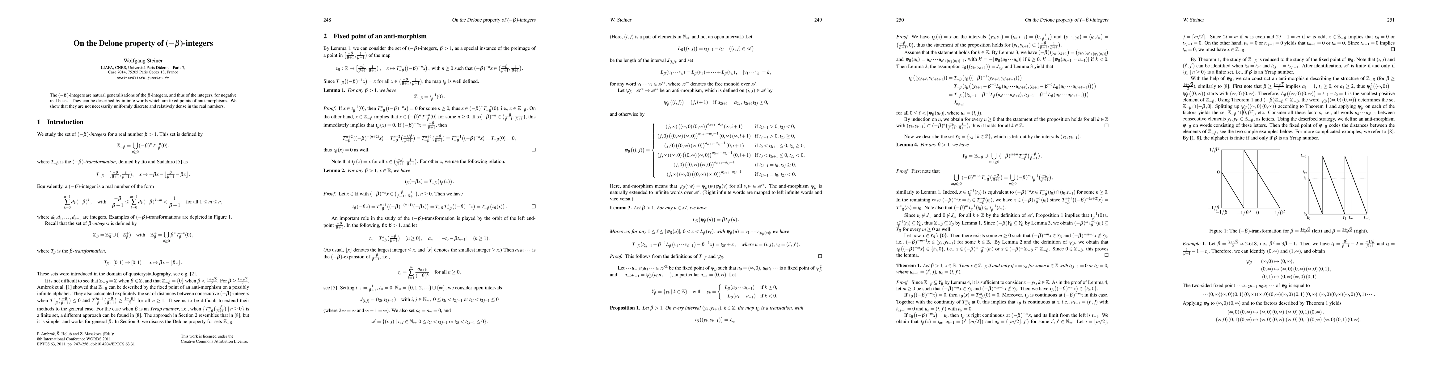 The (-\beta)-integers are natural generalisations of the \beta-integers, and thus of the integers, for negative real bases. They can be described by infinite words which are fixed points of anti-morphisms. We show that they are not necessarily uniformly discrete and relatively dense in the real numbers.