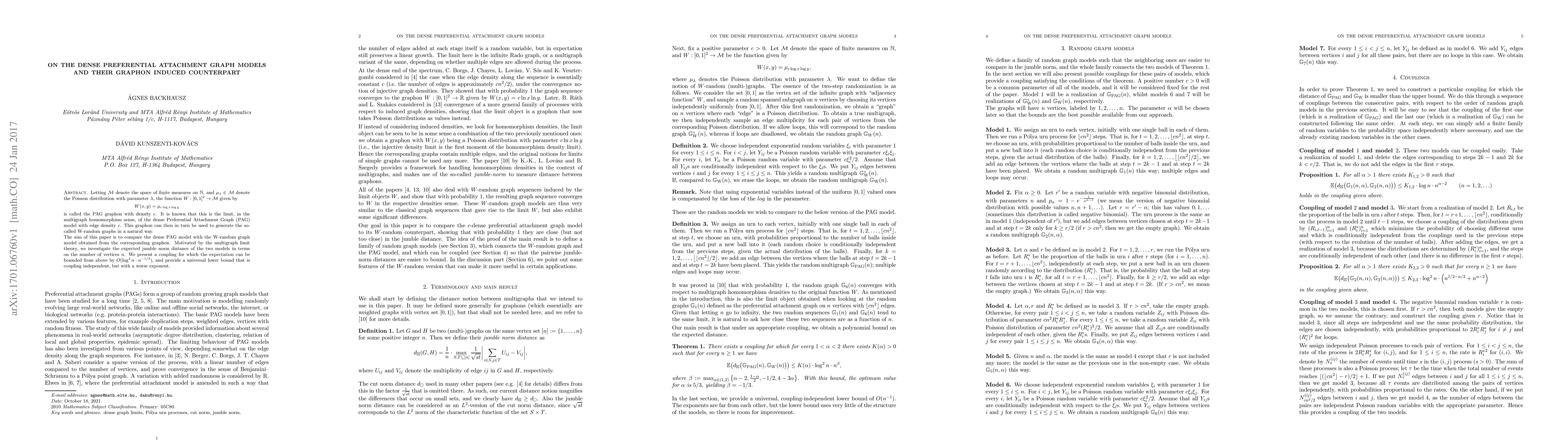 Letting $\mathcal{M}$ denote the space of finite measures on $\mathbb{N}$, and $\mu_\lambda\in\mathcal{M}$ denote the Poisson distribution with parameter $\lambda$, the function $W:[0,1]^2\to\mathcal{M}$ given by \[ W(x,y)=\mu_{c\log x\log y} \] is called the PAG graphon with density $c$. It is known that this is the limit, in the multigraph homomorphism sense, of the dense Preferential Attachment Graph (PAG) model with edge density $c$. This graphon can then in turn be used to generate the so-called W-random graphs in a natural way. The aim of this paper is to compare the dense PAG model with the W-random graph model obtained from the corresponding graphon. Motivated by the multigraph limit theory, we investigate the expected jumble norm distance of the two models in terms on the number of vertices $n$. We present a coupling for which the expectation can be bounded from above by $O(\log^2 n\cdot n^{-1/3})$, and provide a universal lower bound that is coupling independent, but with a worse exponent.