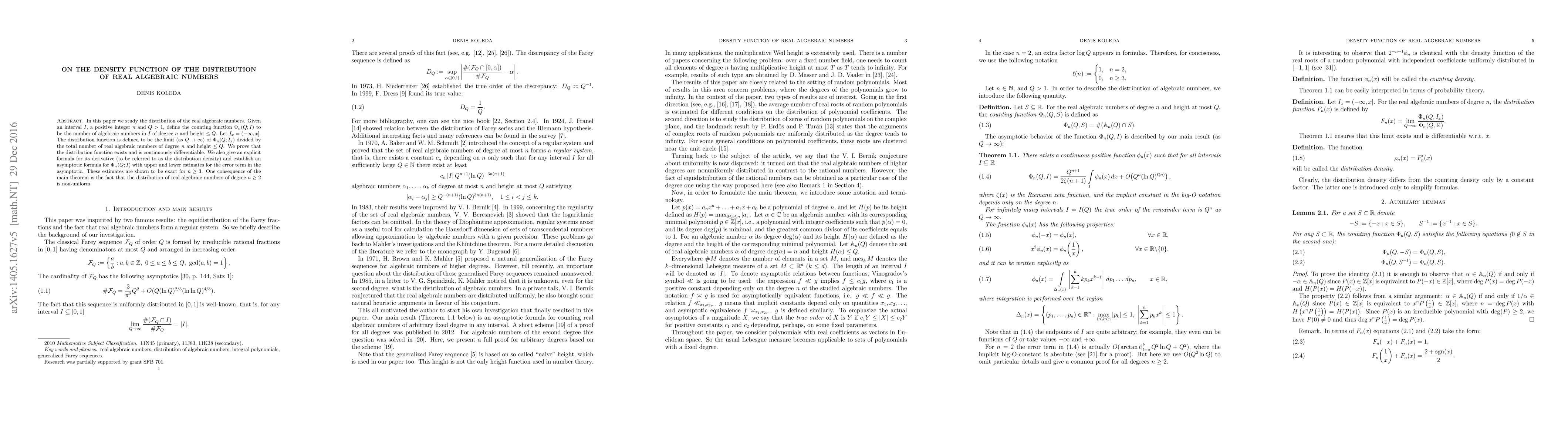 This work presents a novel approach to understanding the distribution of real algebraic numbers, which has implications for our understanding of Diophantine approximation.