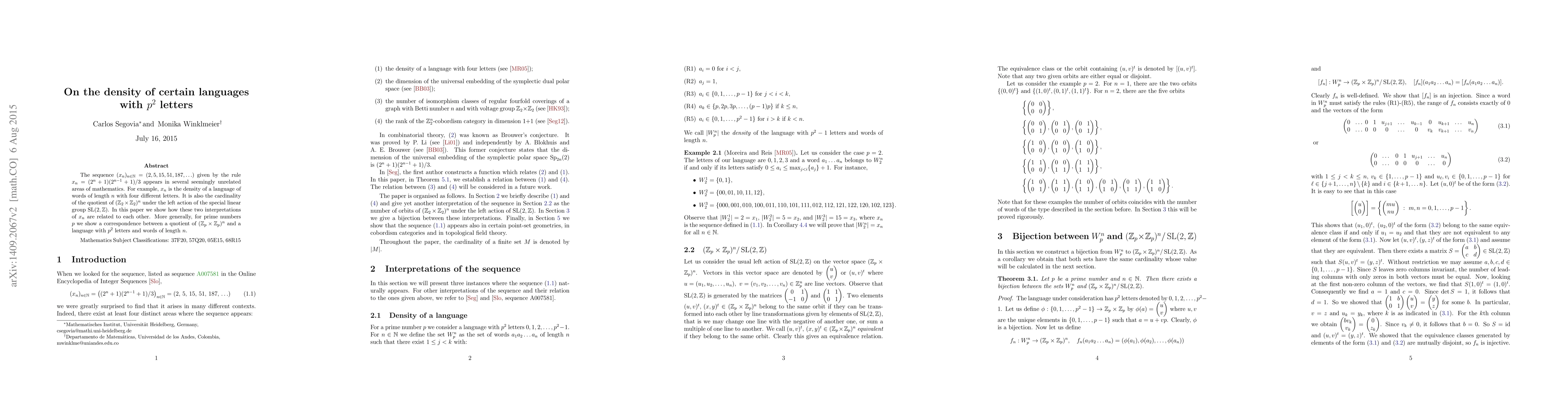 The sequence $(x_n)_{n\in\mathbb N} = (2,5,15,51,187,\dots)$ given by the rule $x_n=(2^n+1)(2^{n-1}+1)/3$ appears in several seemingly unrelated areas of mathematics. For example, $x_n$ is the density of a language of words of length $n$ with four different letters. It is also the cardinality of the quotient of $(\mathbb Z_2\times \mathbb Z_2)^n$ under the left action of the special linear group $\mathrm{SL}(2,\mathbb Z)$. In this paper we show how these two interpretations of $x_n$ are related to each other. More generally, for prime numbers $p$ we show a correspondence between a quotient of $(\mathbb Z_p\times\mathbb Z_p)^n$ and a language with $p^2$ letters and words of length $n$.