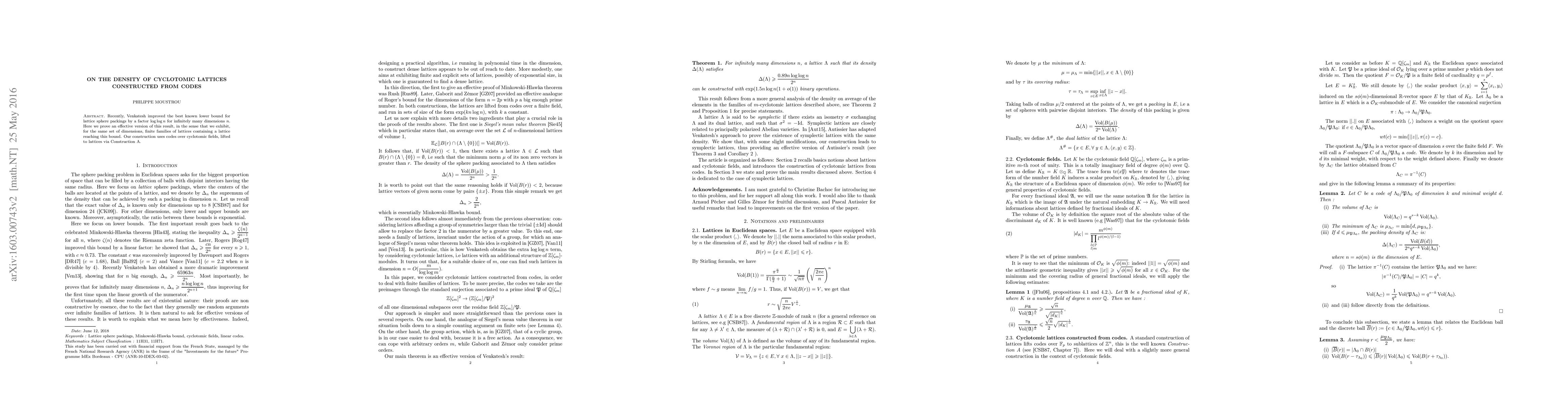 Recently, Venkatesh improved the best known lower bound for lattice sphere packings by a factor $\log\log n$ for infinitely many dimensions $n$. Here we prove an effective version of this result, in the sense that we exhibit, for the same set of dimensions, finite families of lattices containing a lattice reaching this bound. Our construction uses codes over cyclotomic fields, lifted to lattices via Construction A.