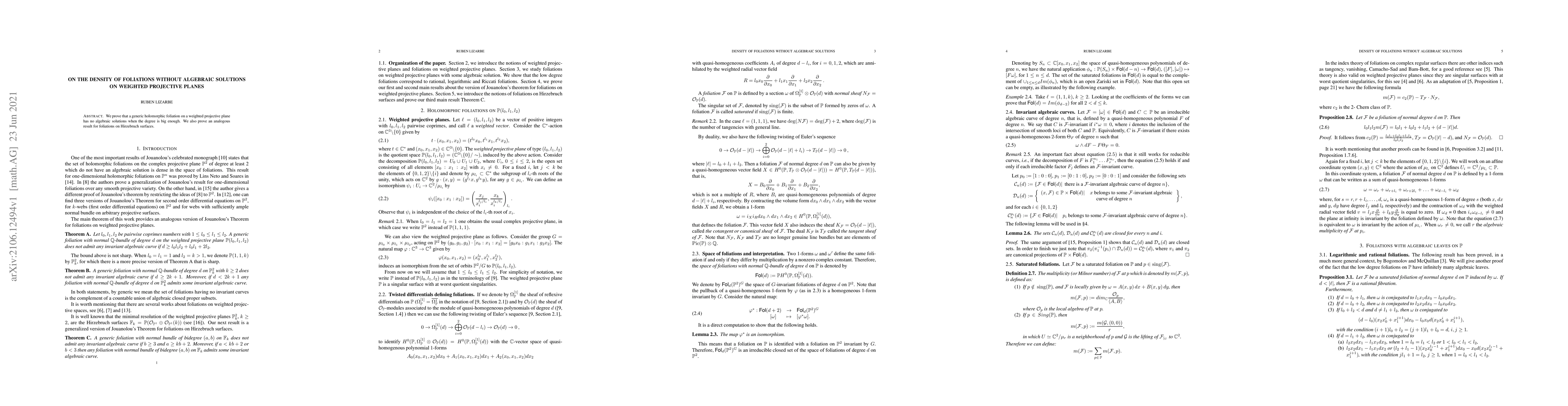 We prove that a generic holomorphic foliation on a weighted projective plane has no algebraic solutions when the degree is big enough. We also prove an analogous result for foliations on Hirzebruch surfaces.
