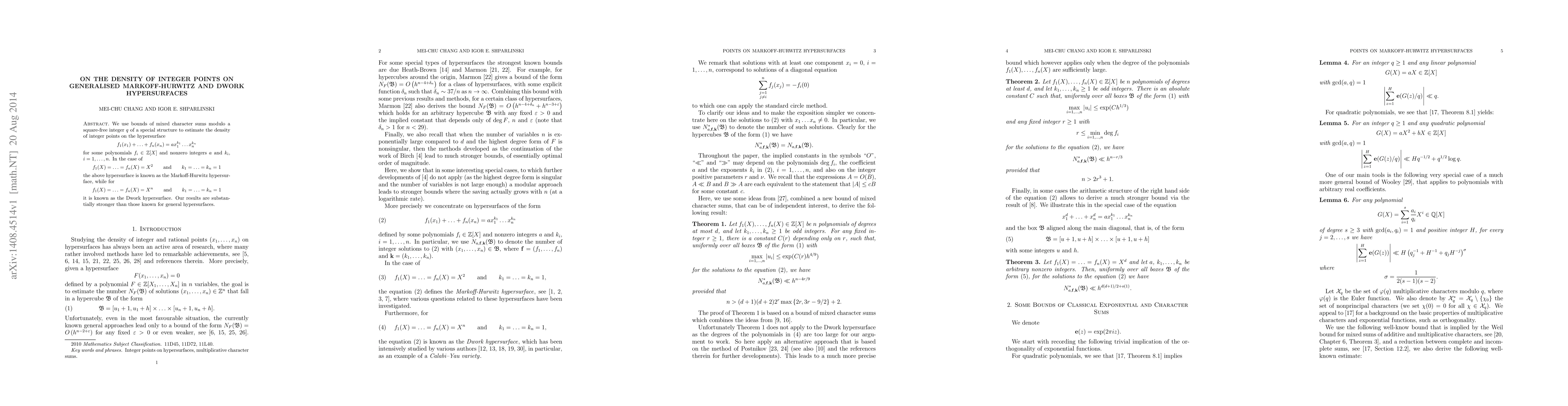 We use bounds of mixed character sums modulo a square-free integer $q$ of a special structure to estimate the density of integer points on the hypersurface $$ f_1(x_1) + \ldots + f_n(x_n) =a x_1^{k_1} \ldots x_n^{k_n} $$ for some polynomials $f_i \in {\mathbb Z}[X]$ and nonzero integers $a$ and $k_i$, $i=1, \ldots, n$. In the case of $$ f_1(X) = \ldots = f_n(X) = X^2\quad \text{and} \quad k_1 = \ldots = k_n =1 $$ the above hypersurface is known as the Markoff-Hurwitz hypersurface, while for $$ f_1(X) = \ldots = f_n(X) = X^n\quad \text{and} \quad k_1 = \ldots = k_n =1 $$ it is known as the Dwork hypersurface. Our results are substantially stronger than those known for general hypersurfaces.